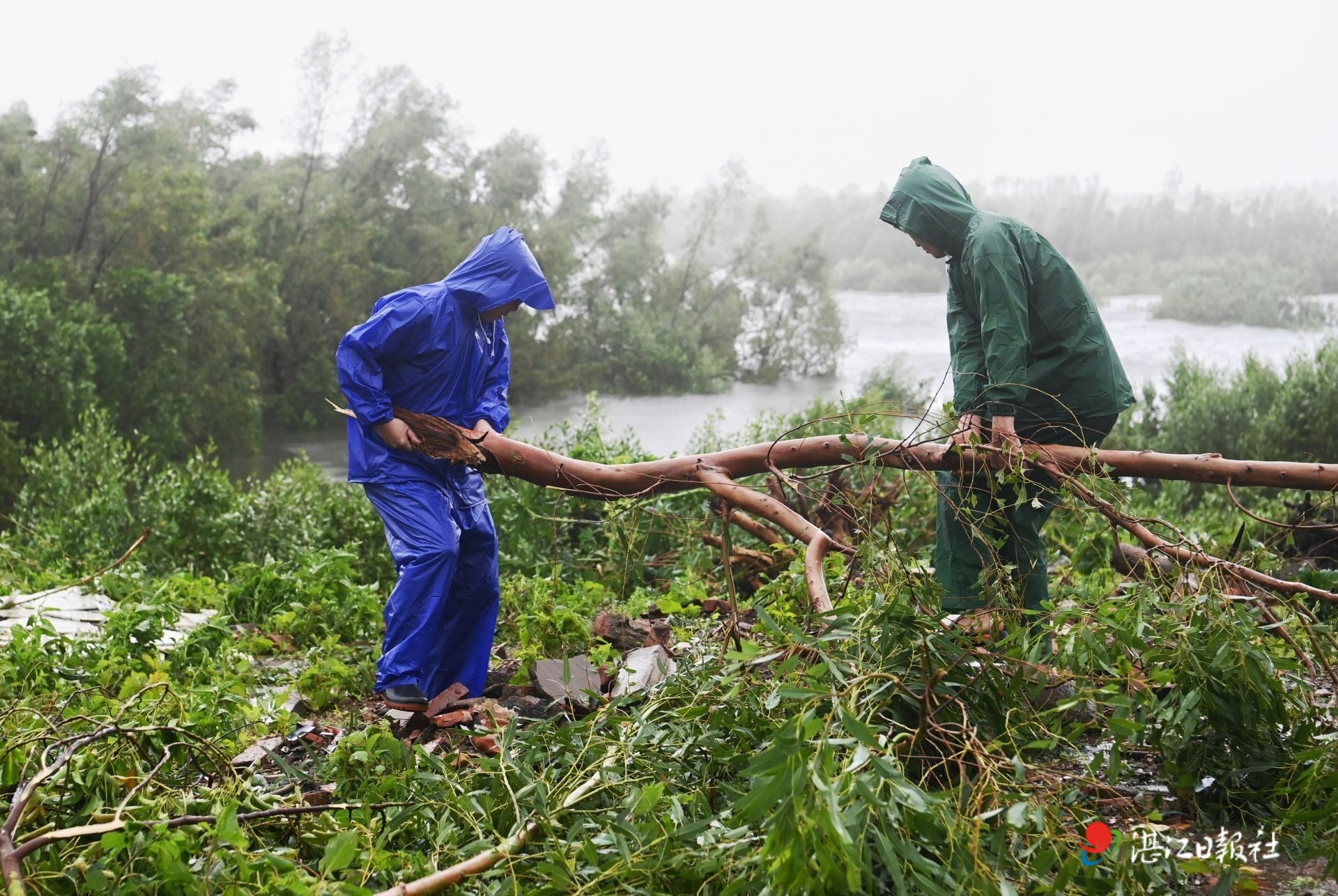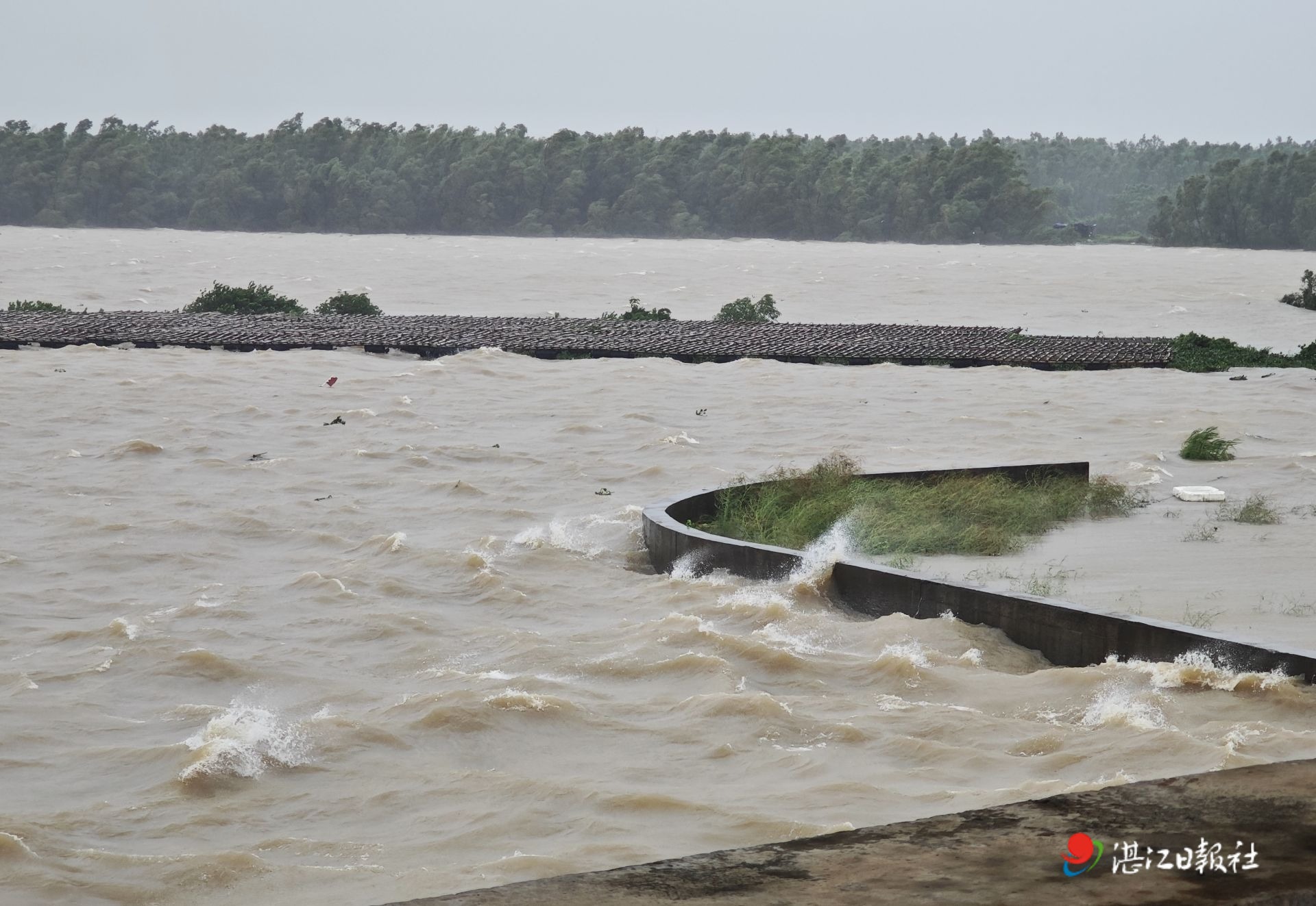 上午10:50左右,记者抵达雷州市区后发现,当地风力已经明显加大,路树摇曳,雨水横飞。工作人员用沙袋,抓紧对沿路的护栏进行加固。在雷州市区前往调风镇的省道上,有不少树被大风吹倒。中午11:45左右,记者在雷州南渡河大堤上看到,这里大风大雨,掀起大浪,水位在逐渐上涨。