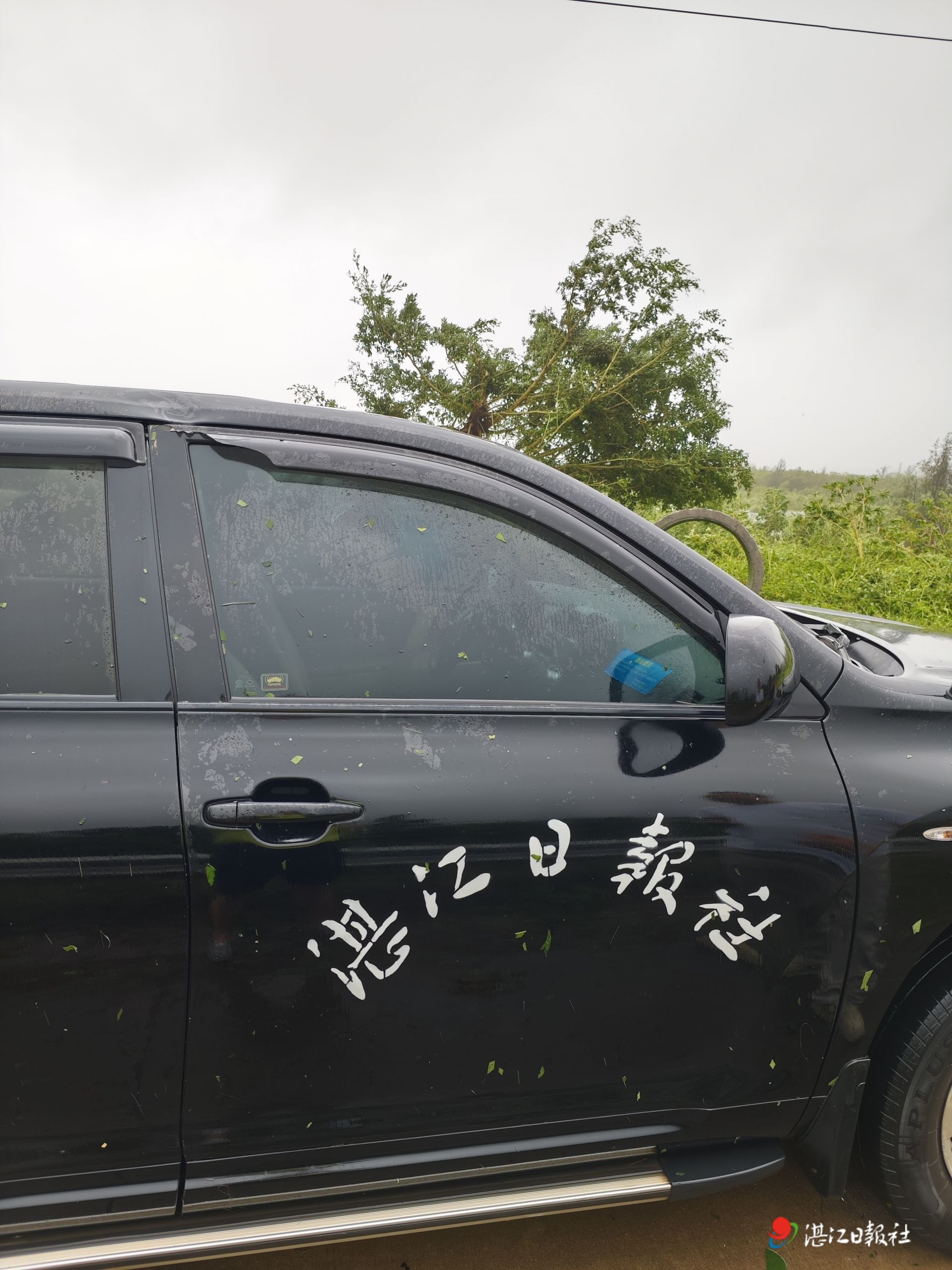 采访过程中,记者经历了狂风暴雨等惊险时刻,近2吨重的采访车在风雨里不停摇晃,在倒伏树木、积水等障碍中艰难前行。中午12时许,湛江日报社的采访车在雷州调风镇坎园村的坎园海堤上进行“追风”采访时,车身被强风吹飞的路树枝干砸凹和撞破。
