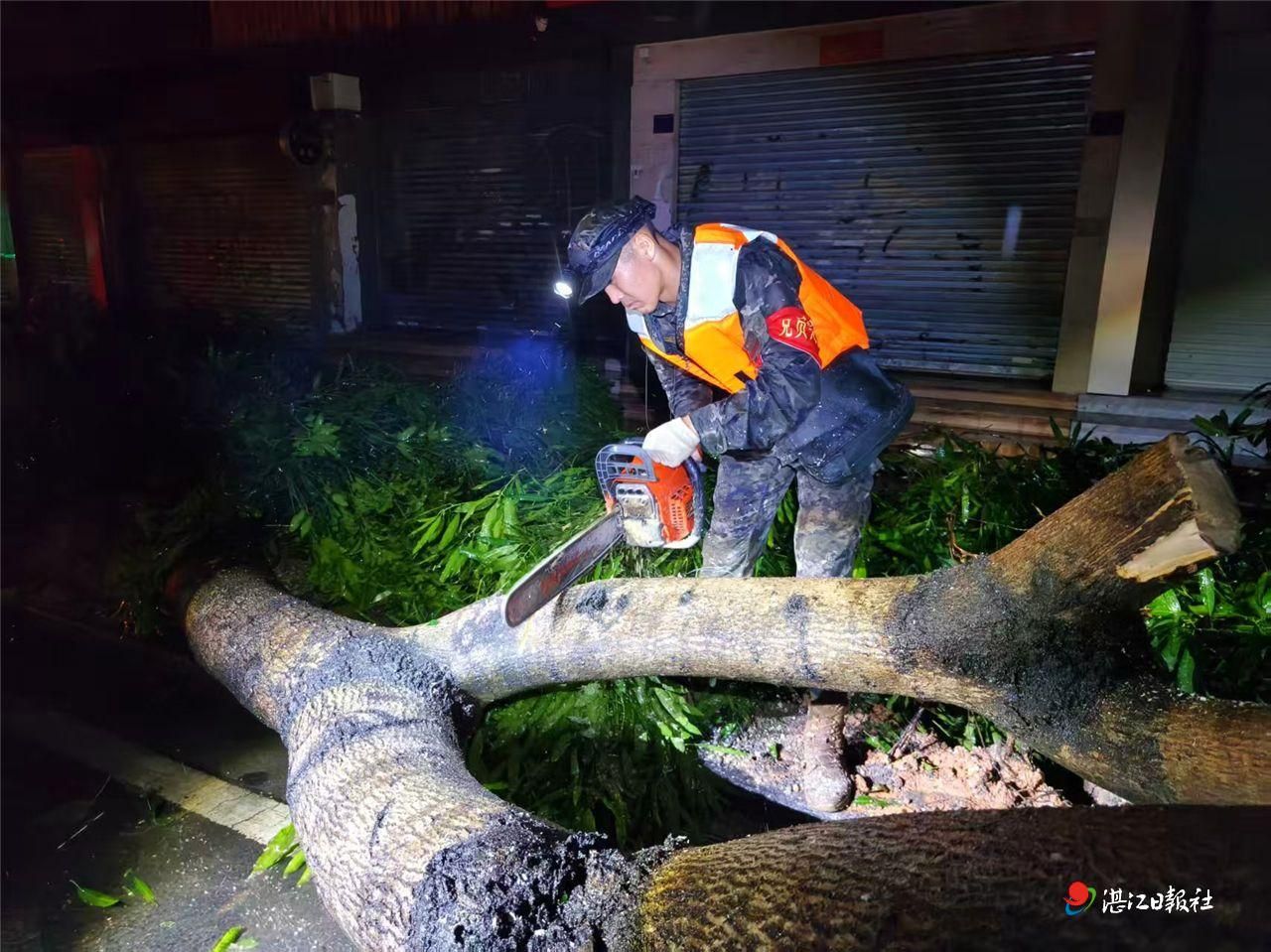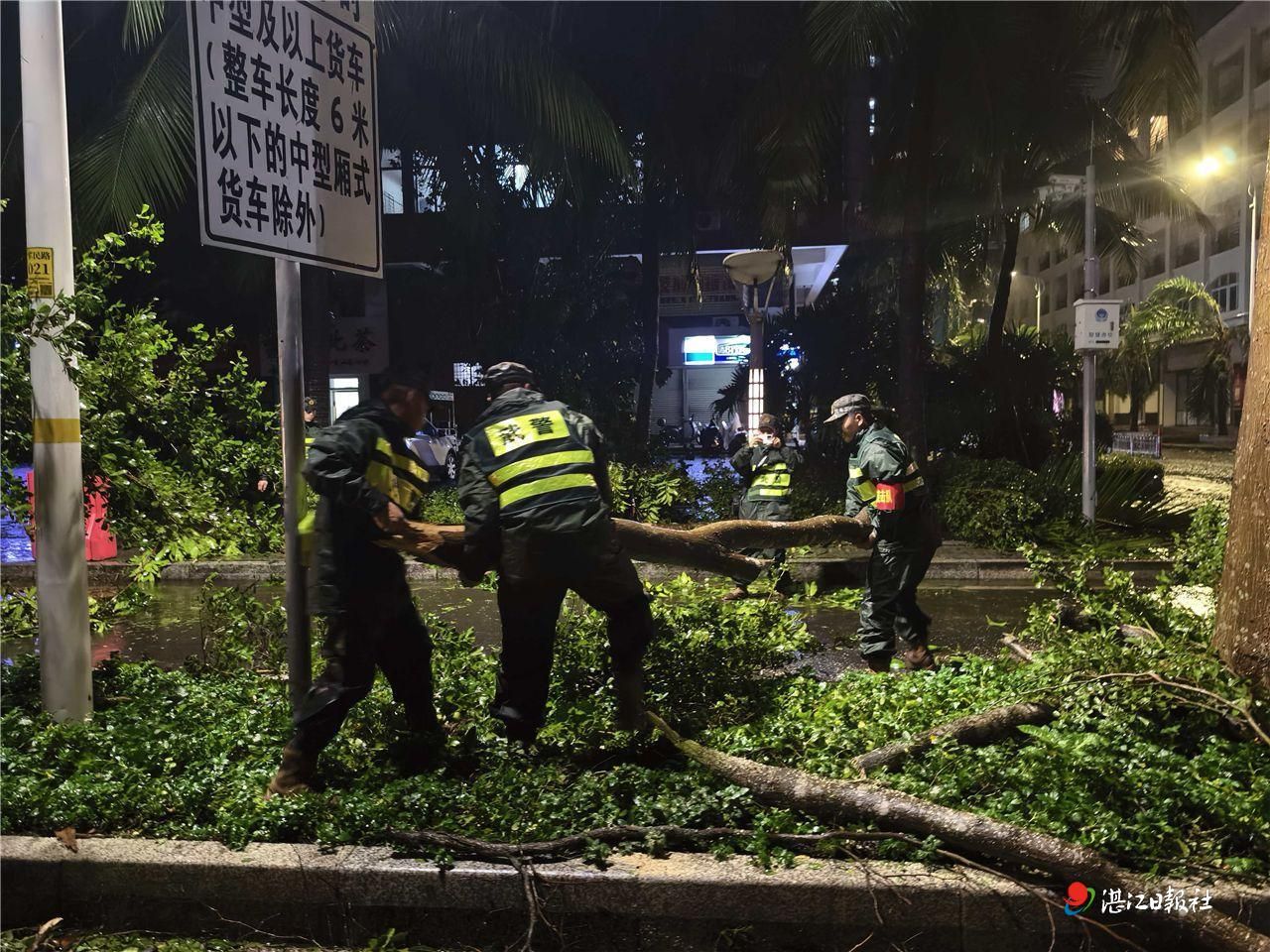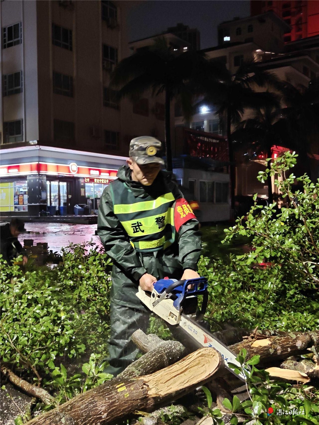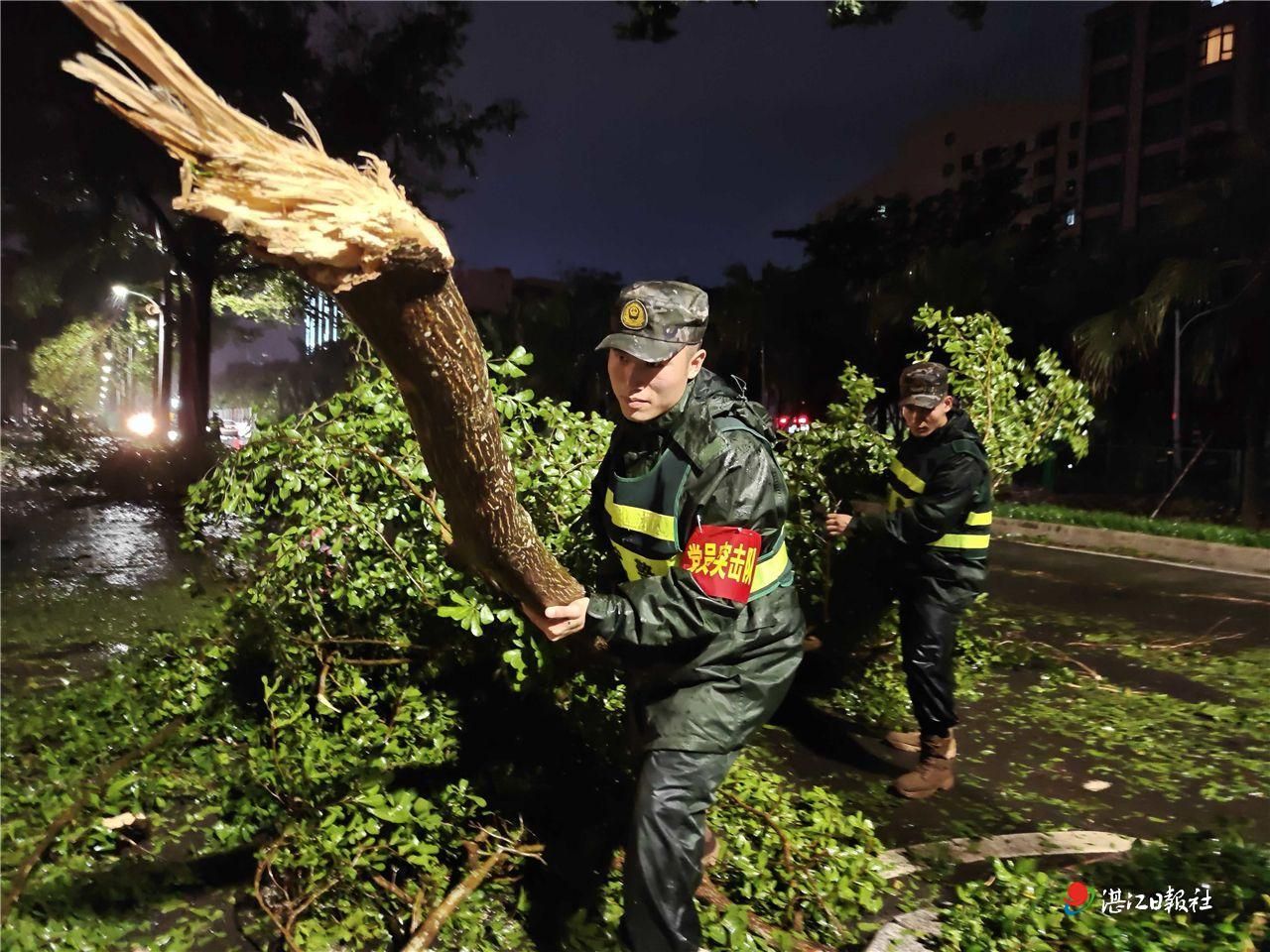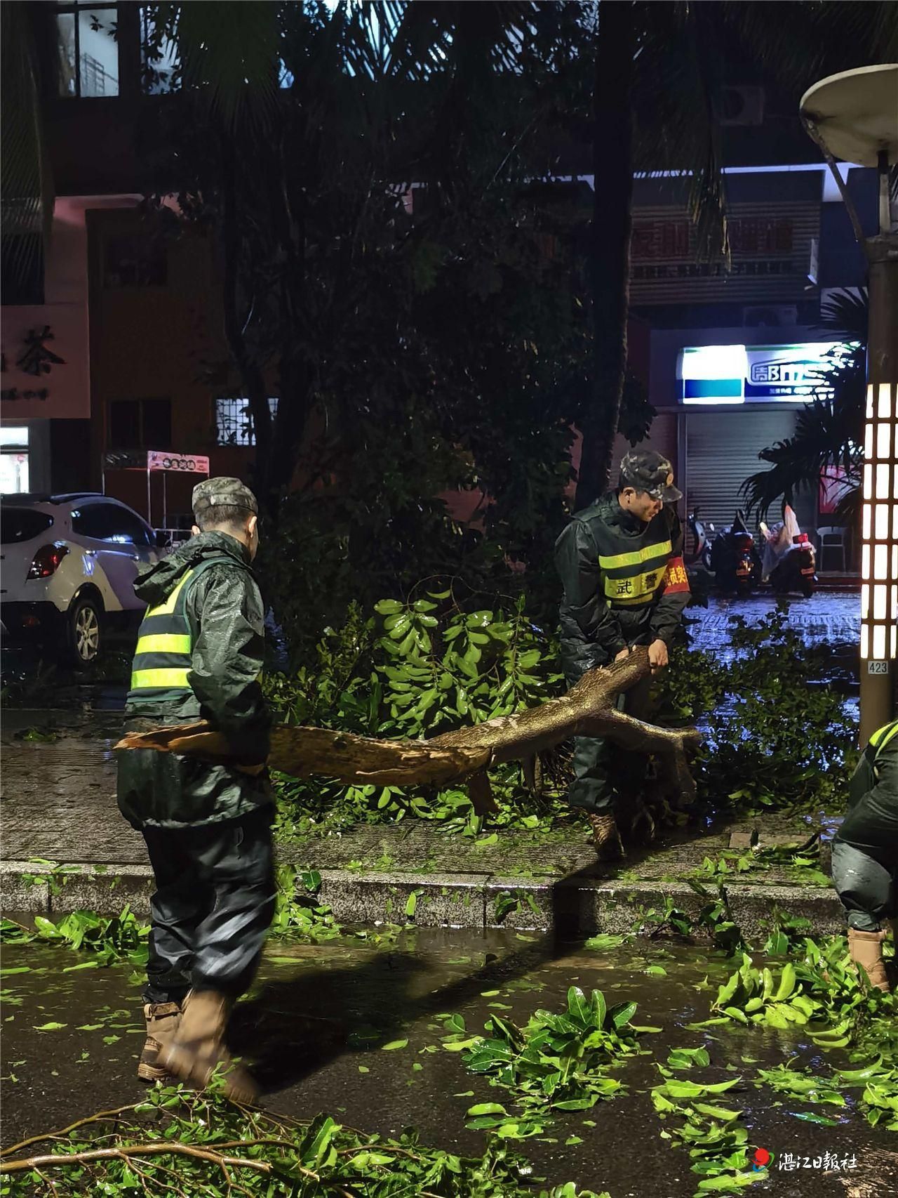 台风肆虐,湛江市区多处路段有被吹倒的林木、淤泥和垃圾,严重影响了交通出行。10月5日21时40分,武警湛江支队紧急出动100名兵力。他们携带油锯、镐头、铁铲等抢险物资,迅速前往赤坎区寸金路、跃进路和康强路等地集结。党员组成先锋突击队,冲锋在前,挺身而出,确保群众人身安全。