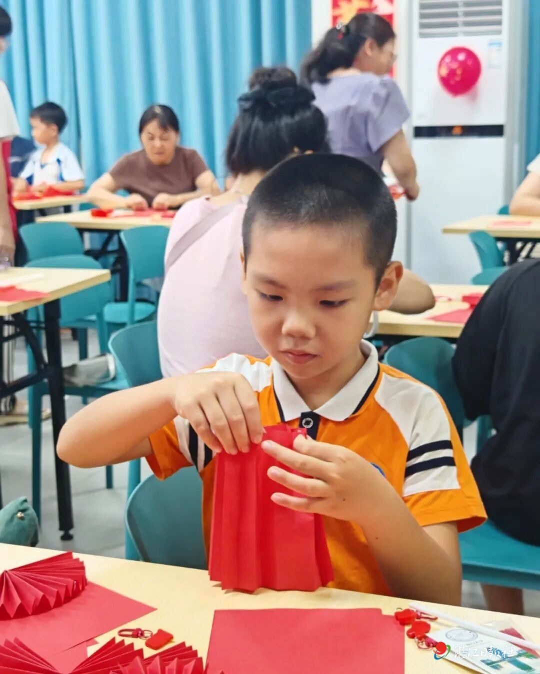 课程结束后,温馨有趣的手工实践环节紧接着展开,将活动氛围推向高潮。孩子们化身为“手工达人”,目不转睛地跟随教学视频学习折、粘、贴等传统技艺。在家长们的协助下,亲子间的协作格外默契,有的孩子小心翼翼地按着彩纸,家长耐心指导折纸的角度;有的亲子搭档,一起将折好的纸片细心粘贴,让灯笼的轮廓渐渐清晰。