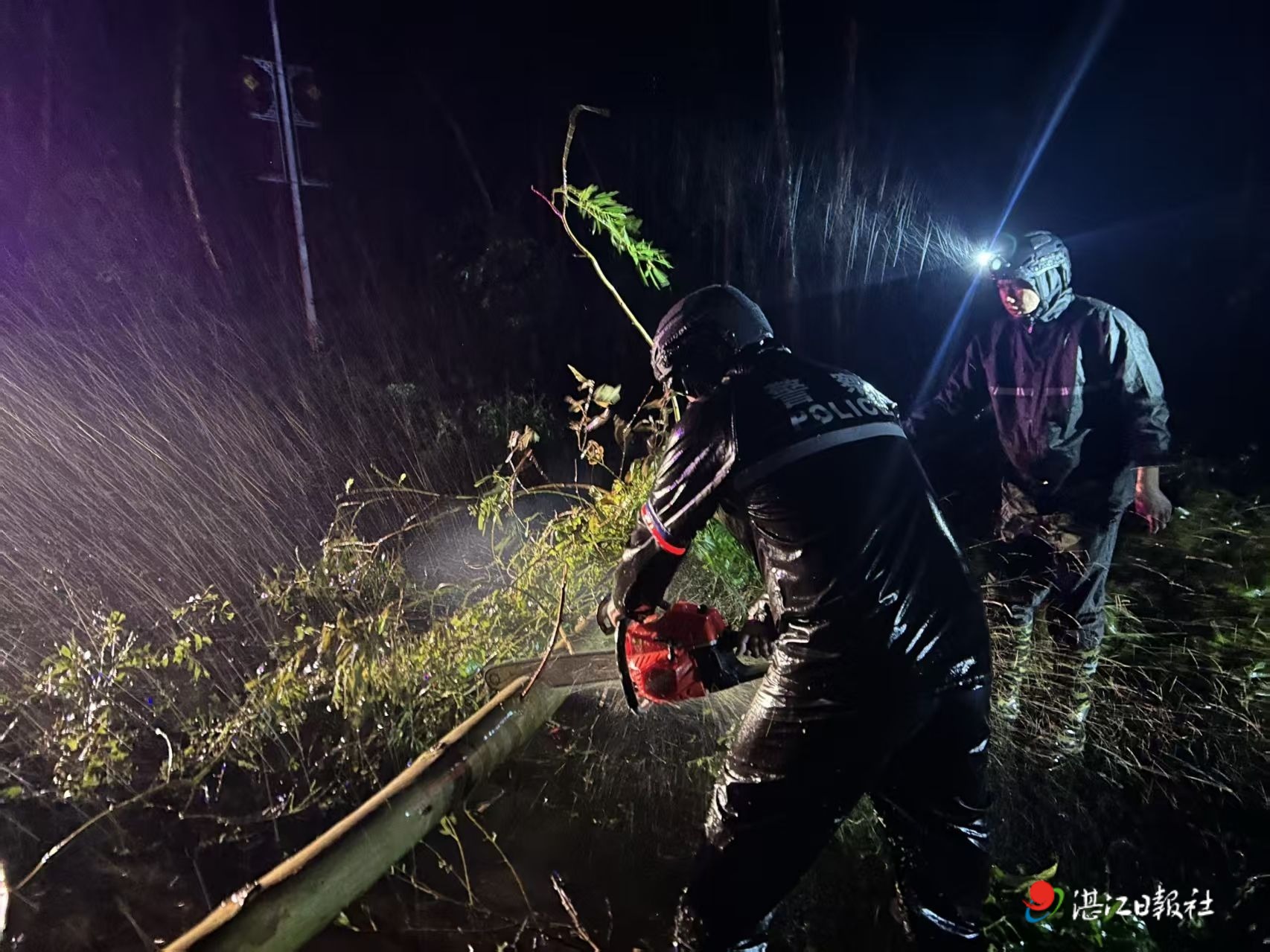 “大家迅速行动,消除安全隐患!”10月5日晚,廉江市东圣路大树倒伏,巡特警10人冒雨电锯砍伐,快速恢复交通;赤坎区调顺路树干横亘路面,民警与群众携手清理,20分钟打通道路。台风过境后,全市公安机关迅速投入到救灾复产工作中,协助清理路障1000多处,及时检查交通设施,加强对高速公路、桥梁等巡查防护,全力以赴做好灾后重建工作。