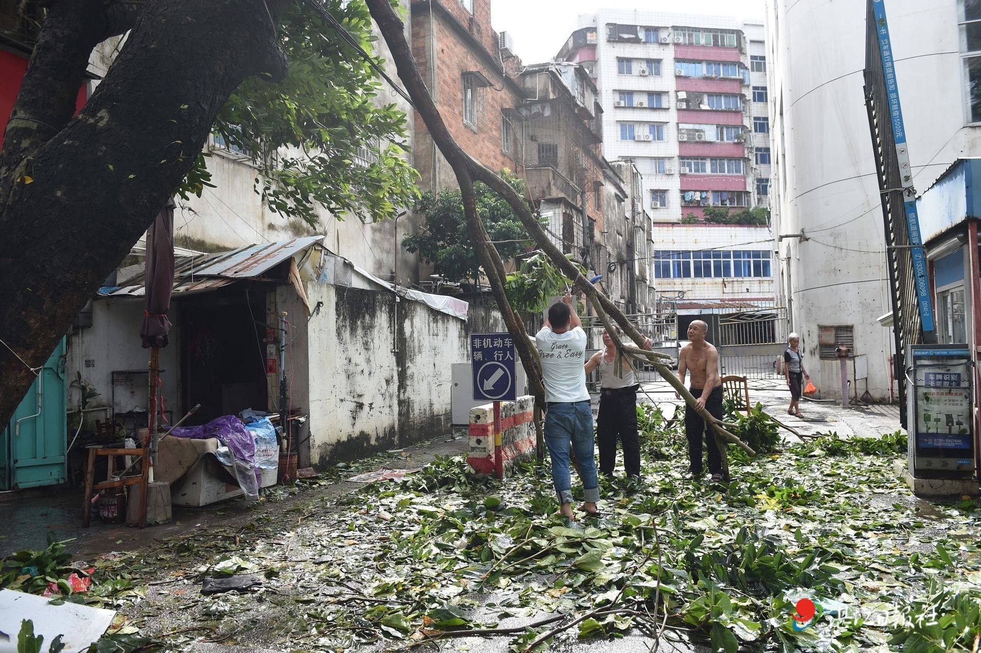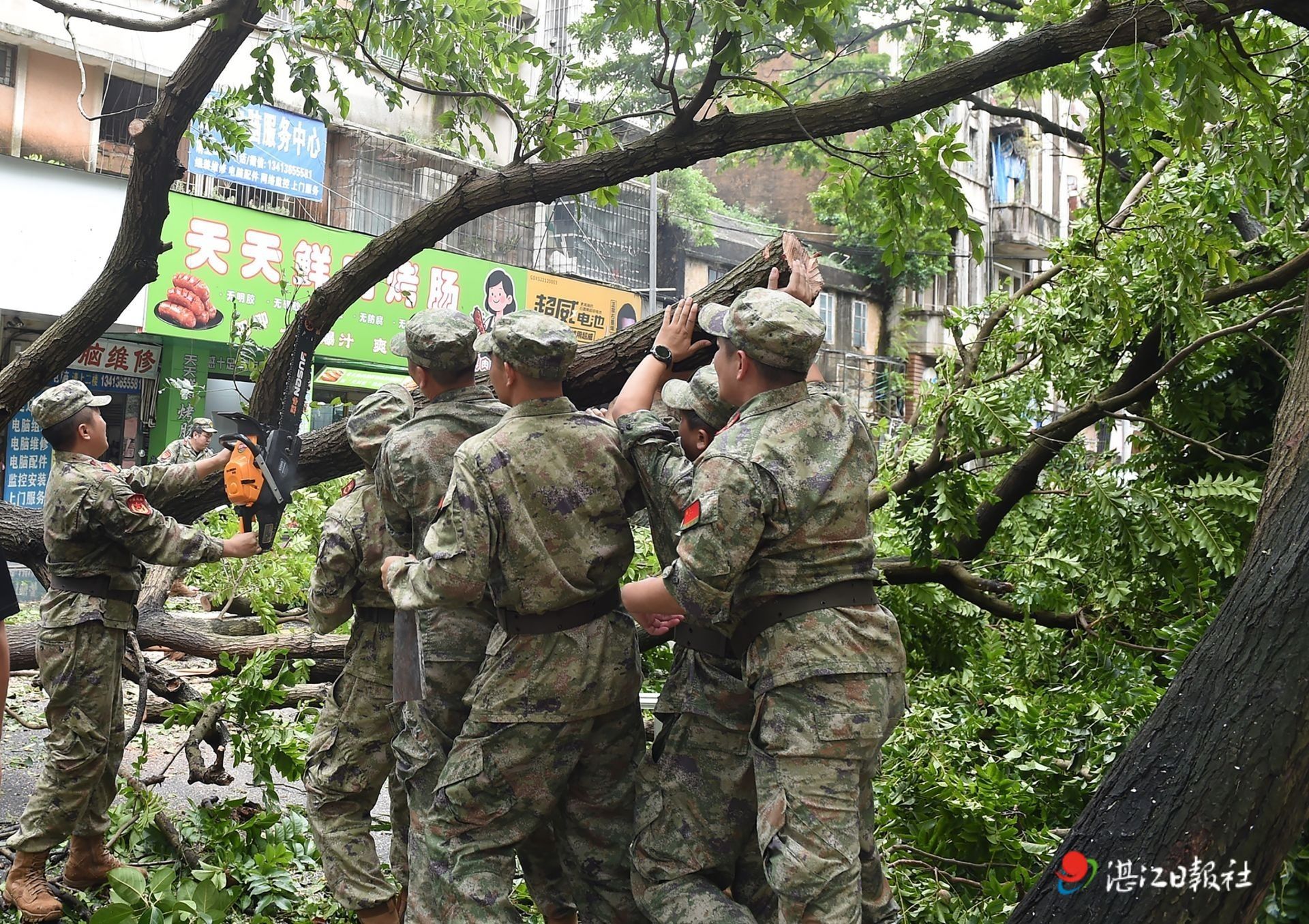 赤坎区民兵应急连官兵正在幸福路清理路障。