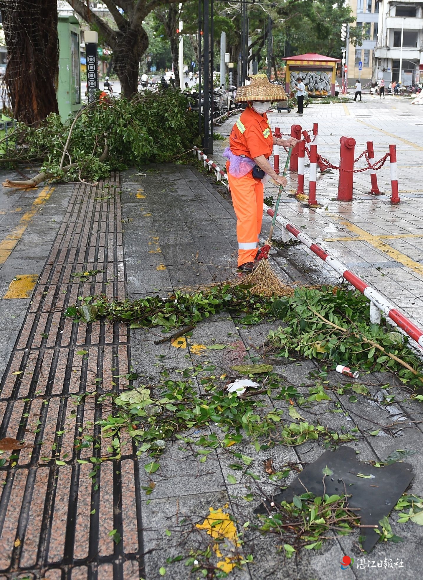 赤坎区环卫工人在中山一路清理路面树枝树叶。