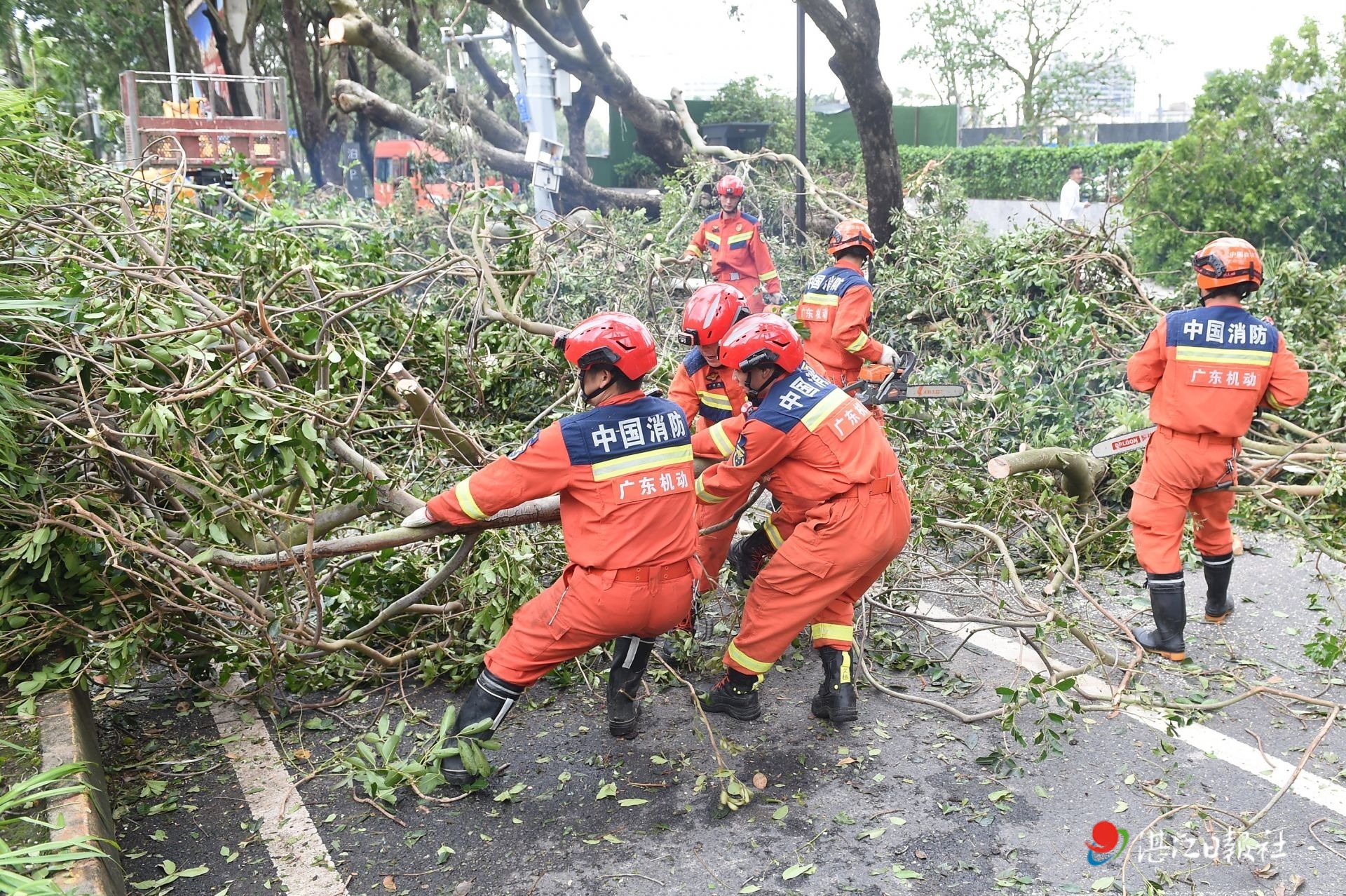 广东消防救援机动总队筹备组东莞驻防分队队员在人民大道北清理路障。