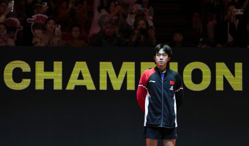 10月5日,在北京举行的2025年世界乒乓球职业大联盟(WTT)中国大满贯赛男子单打决赛中,王楚钦获得冠军。新华社记者 孙非 摄