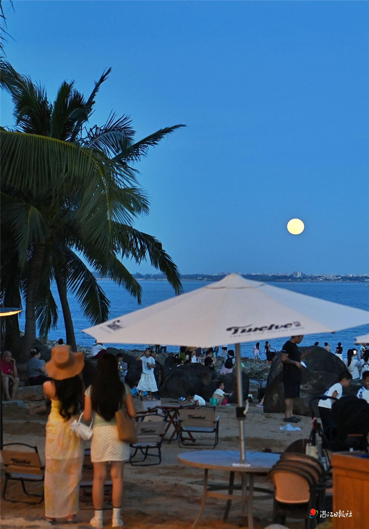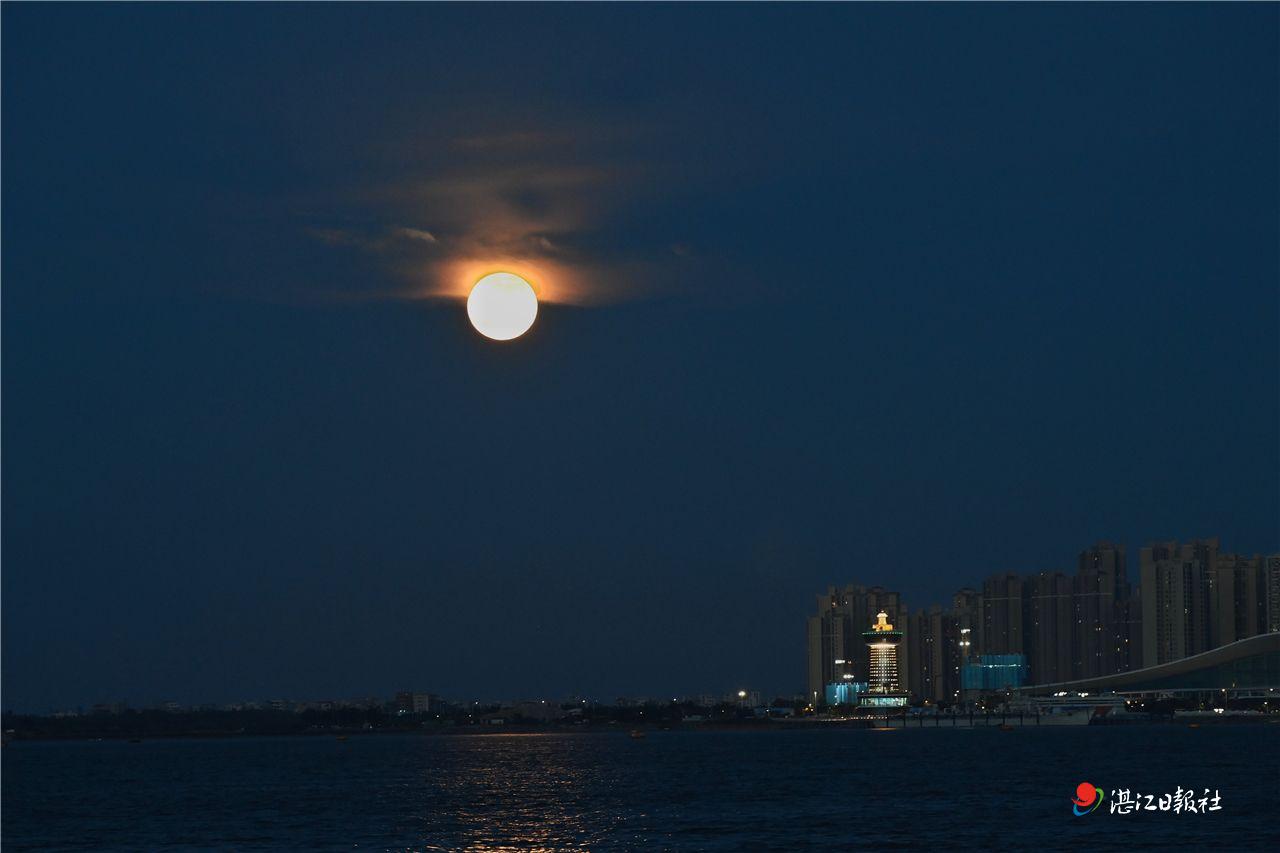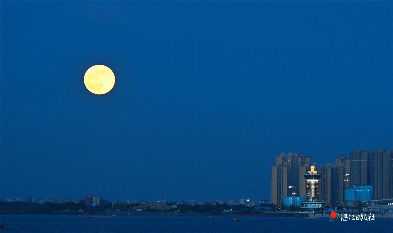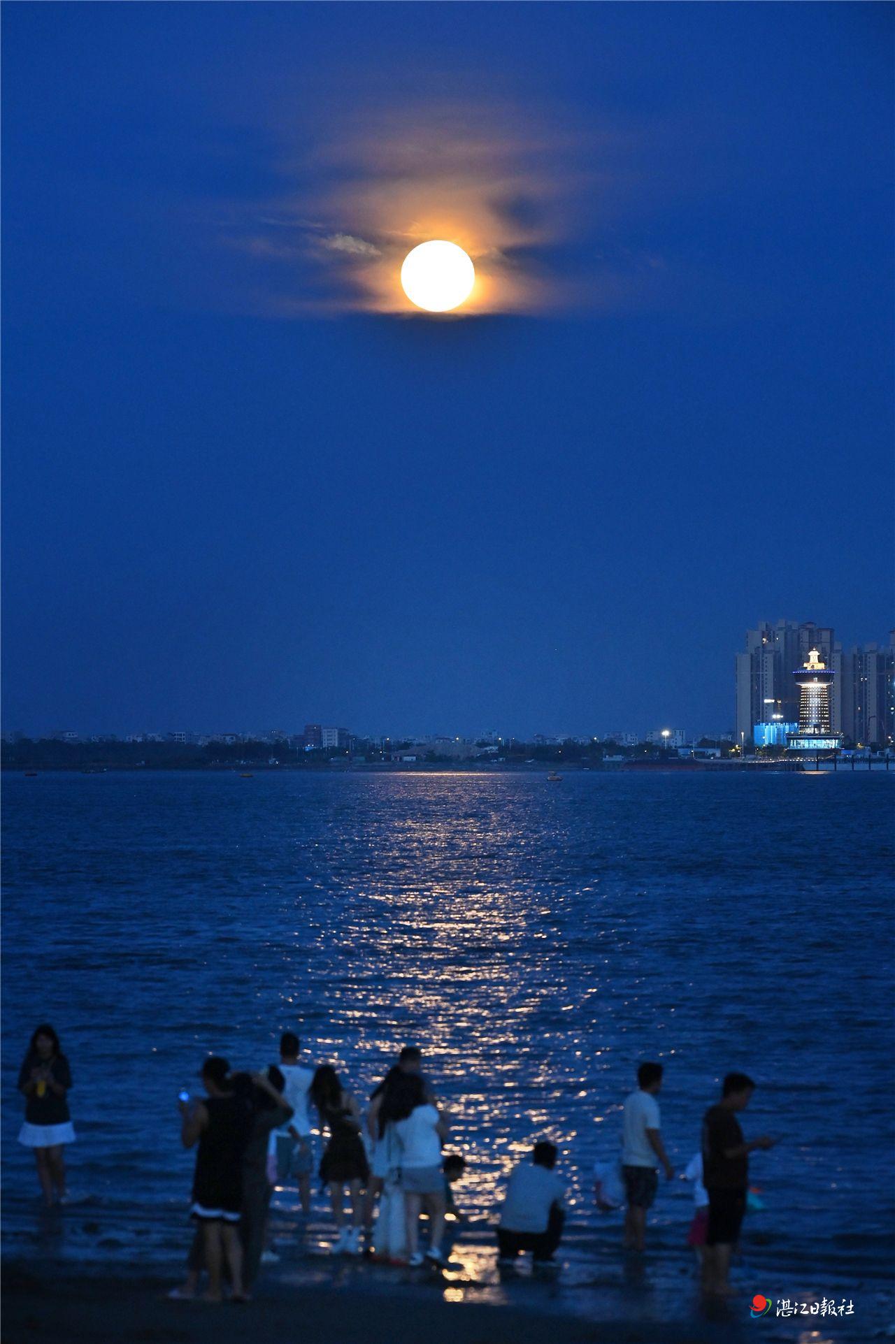 台风过后的赤坎金沙湾沙滩已渐复生机,农历八月十六夜,一轮饱满圆月从海面升起,清辉洒满滩涂。市民游客踏浪散步,笑语随海风漫过刚清理完的岸线,为这场“迟到的赏月”添了暖意。