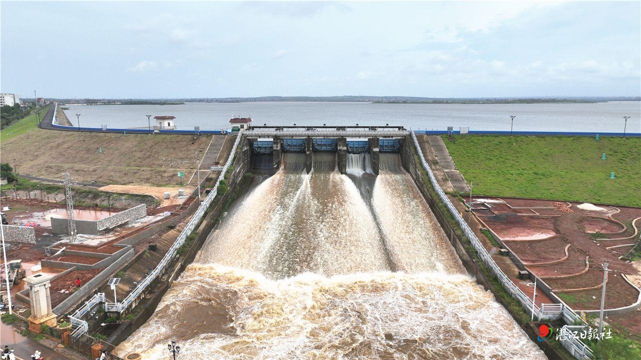 受台风“麦德姆”影响,10月5日徐闻大水桥水库超汛限0.09米。为保障水库度汛安全,经徐闻县三防指挥部同意,大水桥水库于10月5日20时30分起泄洪(如图,记者郎树臣 摄),流量为80立方米每秒。