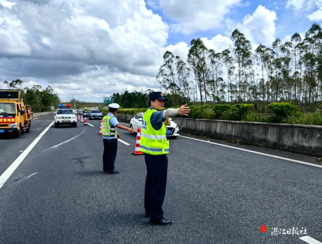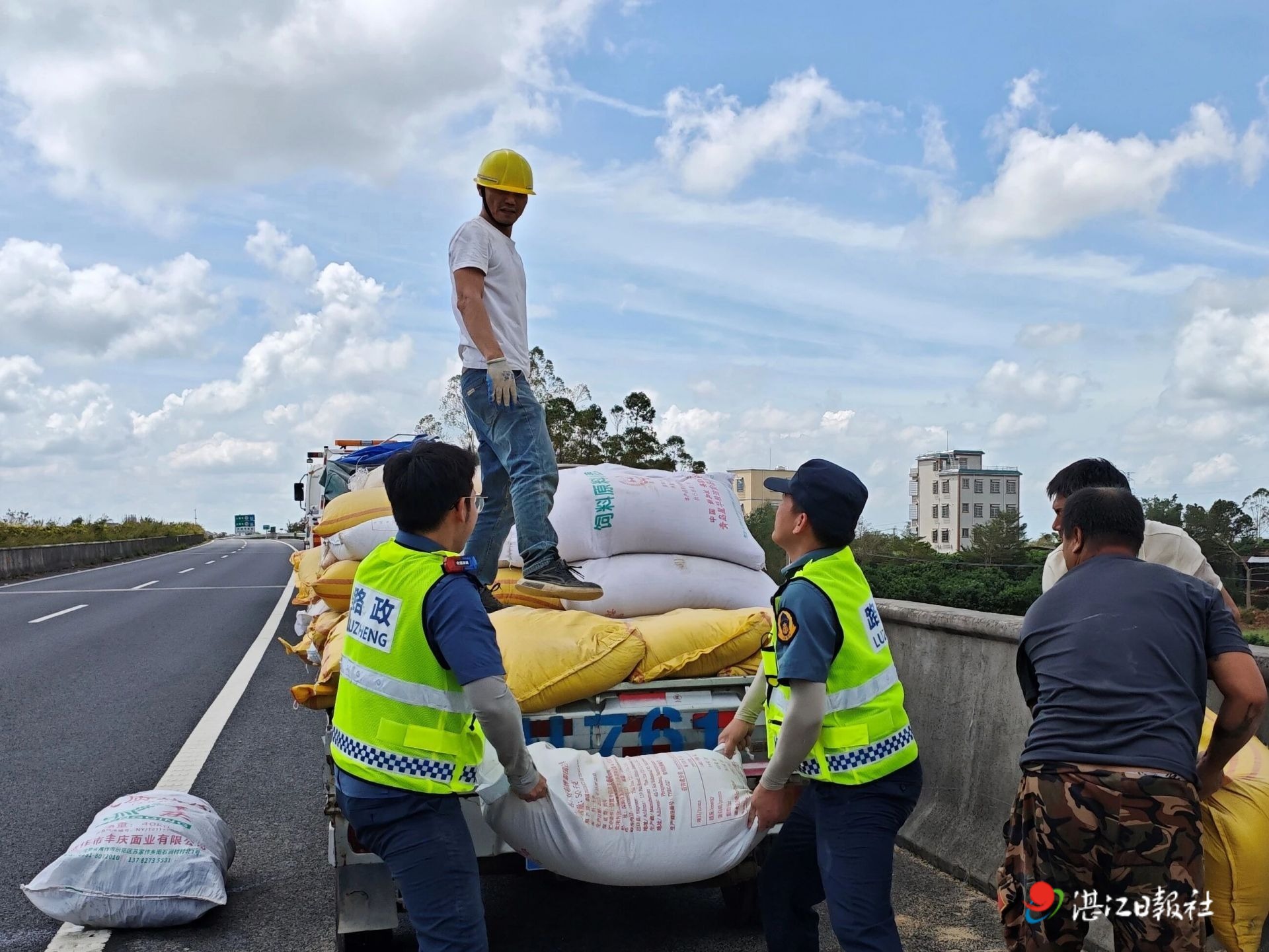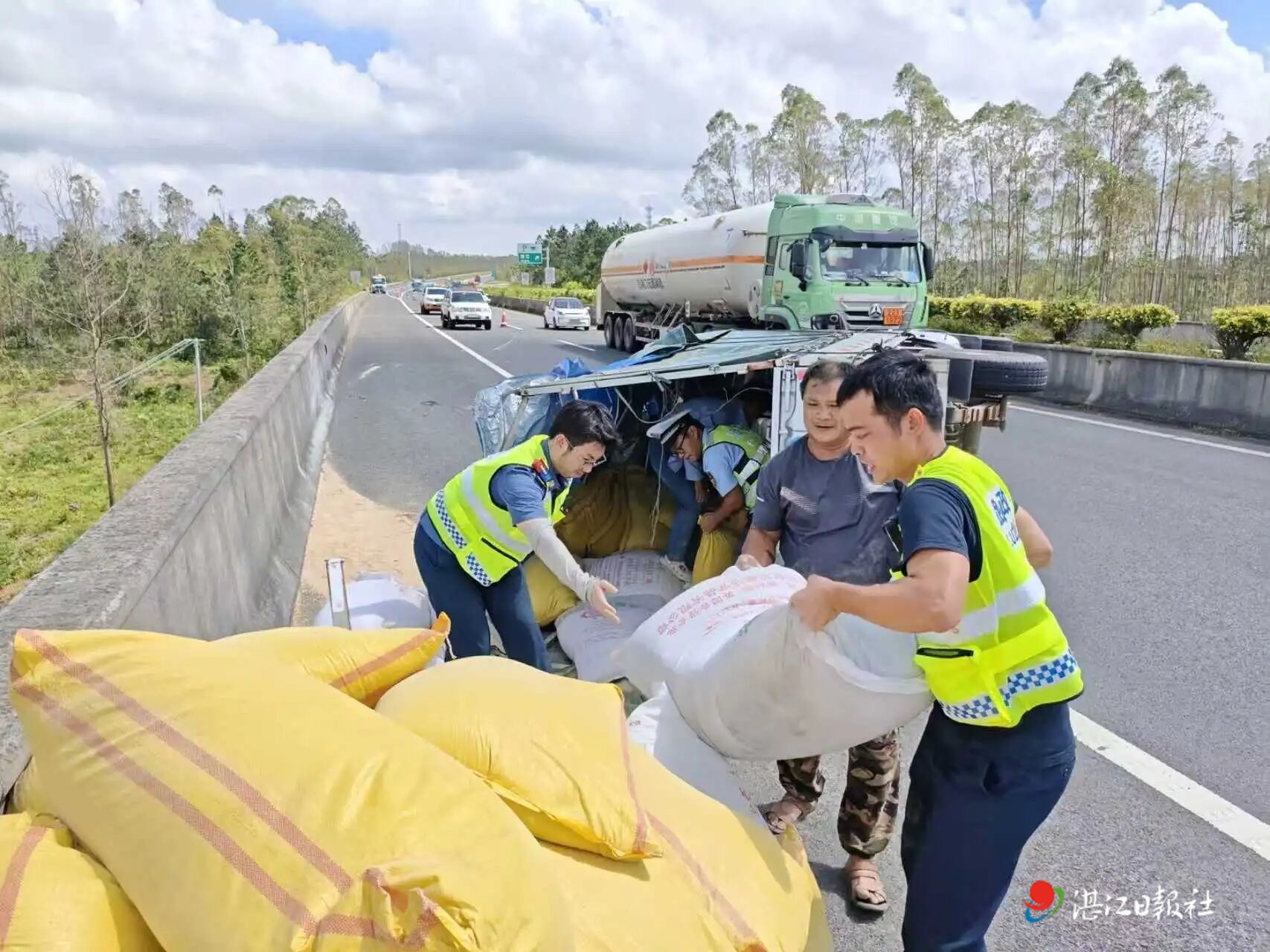 10月7日,国庆中秋双节返程高峰,化廉高速往廉江方向K41路段突发险情,一辆满载2吨大米和麦皮的轻型货车因爆胎侧翻,横卧车道致车流拥堵。危急时刻,路政与交警迅速联动,创新救援流程、徒手搬运货物,仅用30分钟便完成清障保通,既帮司机挽回货物损失,又保障了返程车流顺畅。