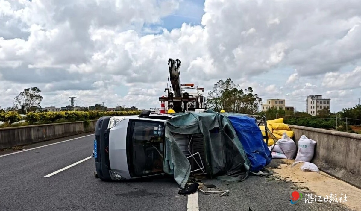 当日上午10时56分,化廉高速车流如潮,往廉江方向K41路段突然传来刺耳刹车声。轻型货车爆胎后侧翻在第二车道与路肩之间,车上大米、麦皮散落一地,原本顺畅的车流瞬间拥堵。空气中弥漫着轮胎焦味,司机望着迅速聚拢的乌云急得直跺脚:“这2吨货要是被雨淋湿,我这趟就全赔了!”