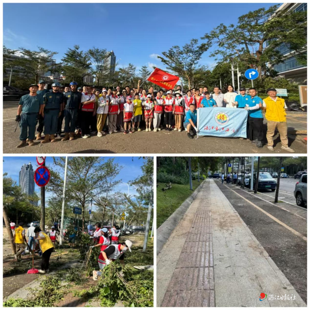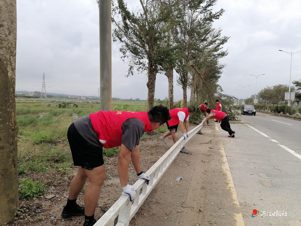 赤坎区发动800余名志愿者,聚焦主次干道、居民小区、景区及背街小巷,分工切割搬运倒伏树木、清扫断枝、疏通排水口,不少居民自发递水送工具,干群同心护家园;霞山区组建17支志愿服务队,380余人次奔赴一线,累计清理道路障碍250余处、疏通积水路段80余处、抢修供水基础设施10余处;麻章区200余名党员先锋与青年志愿者合力清障,清除倒伏树木1000余棵、扶正道路防护栏20余公里;坡头区1120名志愿者冒风雨拉网式排查镇(街)道路,累计清理垃圾15吨、疏通道路约45公里、处理倾倒树木2150余棵、扶起护栏约125公里。