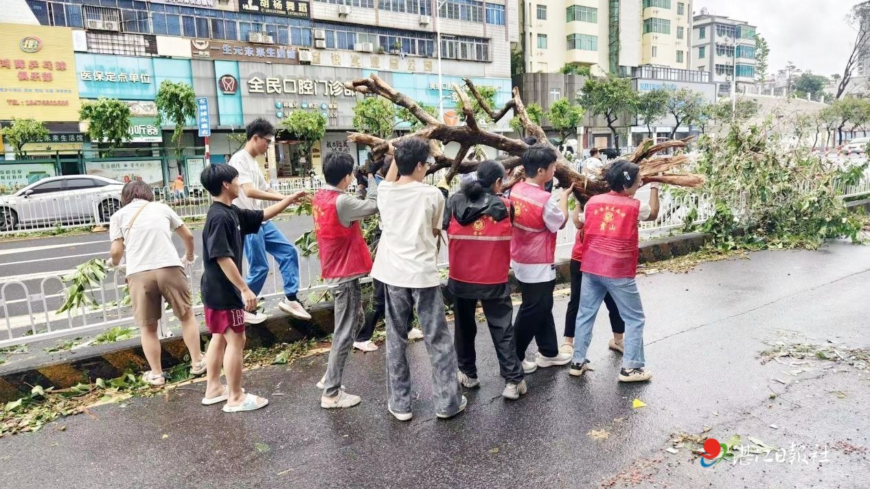 面对路面随处可见的倒伏树木,志愿者们分工协作、相互配合,高效进行路面的清障工作。其中,有人手持电锯精准切割挡路的断枝,有人合力将沉重的树干移离道路,有人手持扫帚弯腰清理散落的枝叶杂物和积水,确保道路恢复整洁畅通。与此同时,还有部分志愿者负责在路口协助疏导交通,引导车辆绕行作业区,扶起路旁倒下的共享电动车。“台风过后看到外面一片狼藉,我立马就报名参与行动了。多个人多出一分力,早把路打通,大家出门也方便。”一名青年志愿者表示。