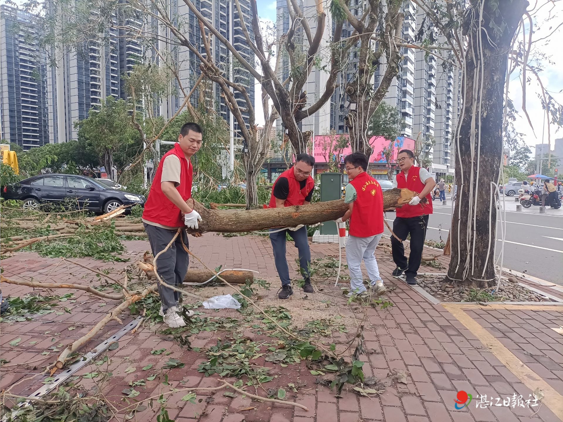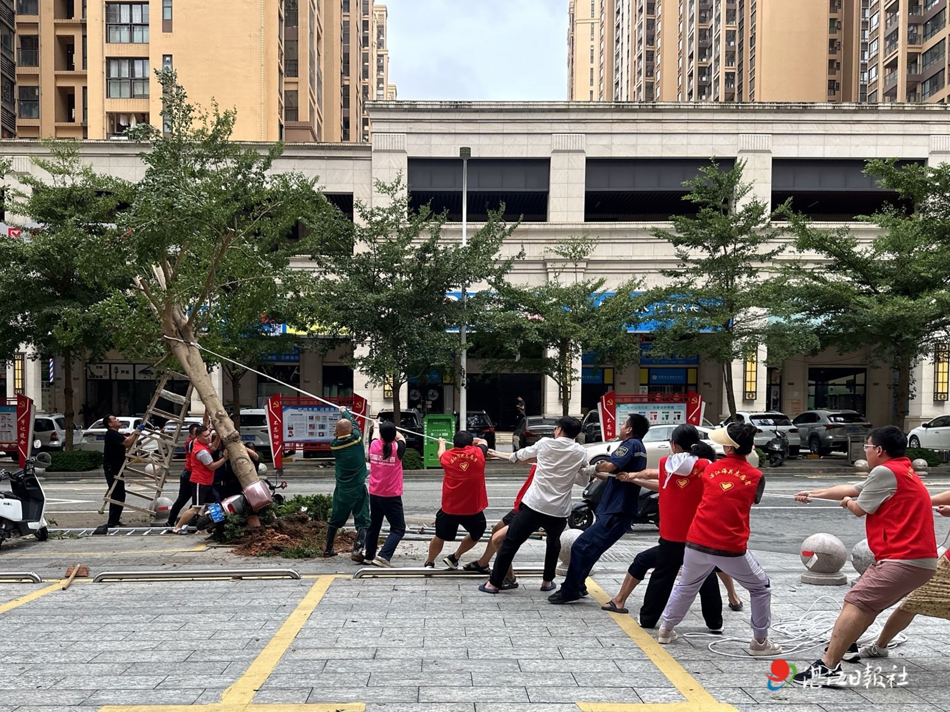 在社区街道上,身穿红马甲的志愿者们成为最亮眼的风景线。他们合力搬运粗壮的倒伏树干,树干沉重,却丝毫没有影响大家的干劲,众人齐心协力,将树干移至不影响交通的区域;面对歪斜的树木,志愿者们又拿出绳索,默契配合,用力牵引,让树木恢复直立。