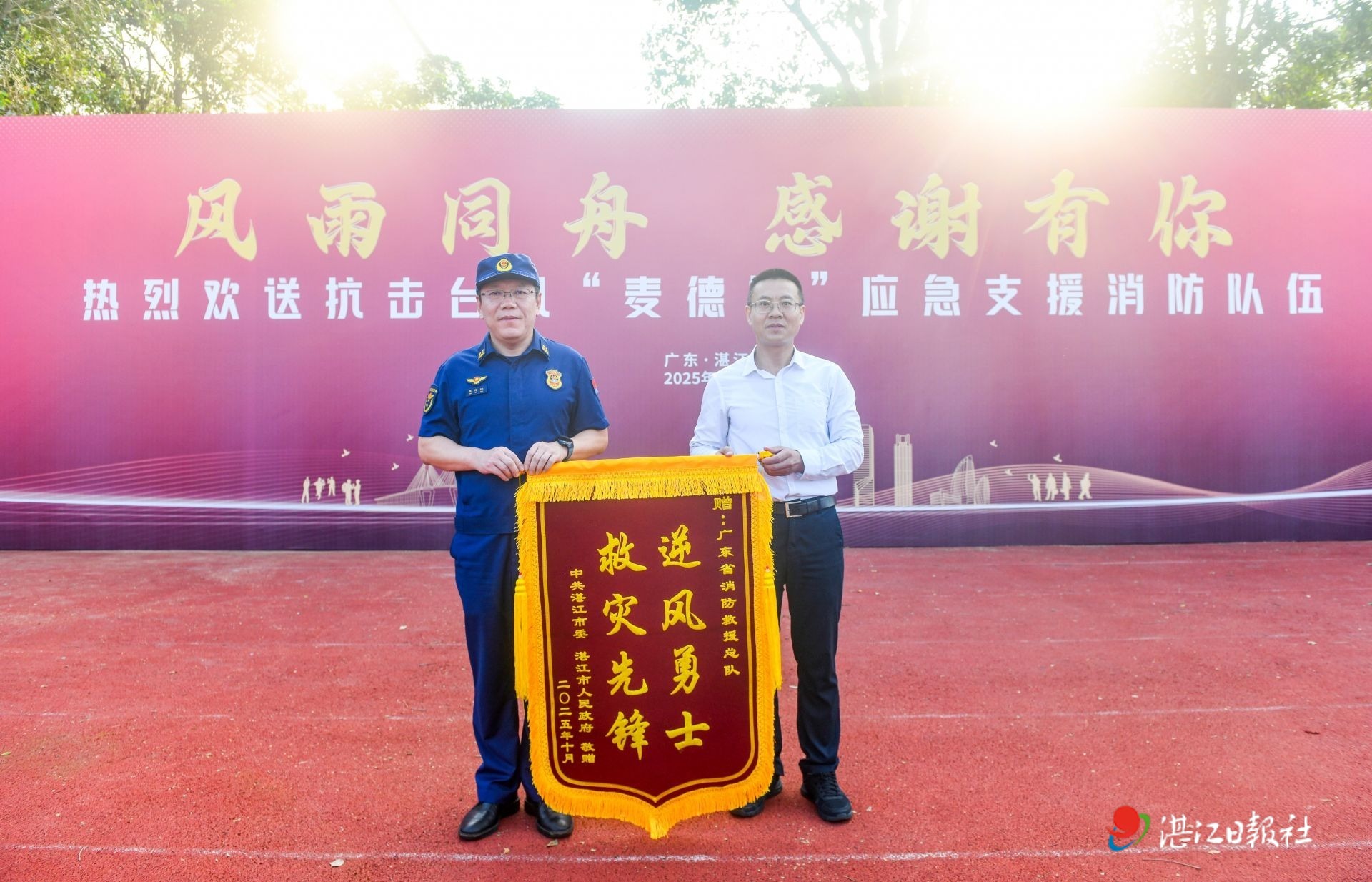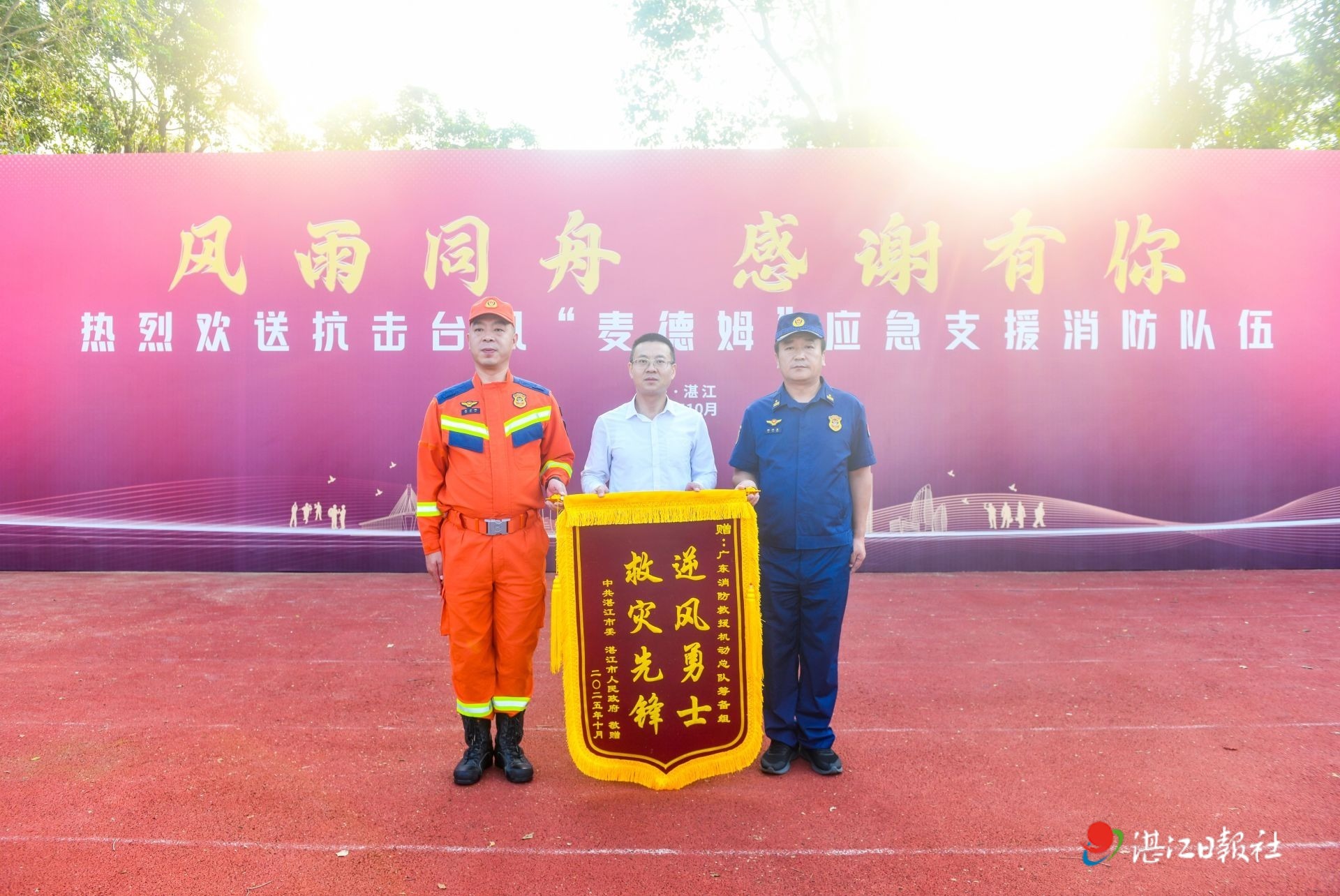 湛江市委有关领导向广东省消防救援总队、广东消防救援机动总队抗击台风“麦德姆”应急支援队伍的队员们致以最崇高的敬意和最诚挚的谢意,并向相关代表赠送锦旗。