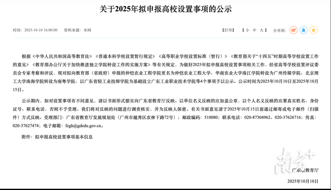 10月10日,广东省教育厅公示,拟向教育部(省政府)申报仲恺农业工程学院更名为仲恺农业工程大学、华南农业大学珠江学院转设为广州传媒学院、北京理工大学珠海学院转设为南粤学院、以广东省轻工业技师学院为基础设立广东工业职业技术学院。公示时间为2025年10月10日至2025年10月15日。
