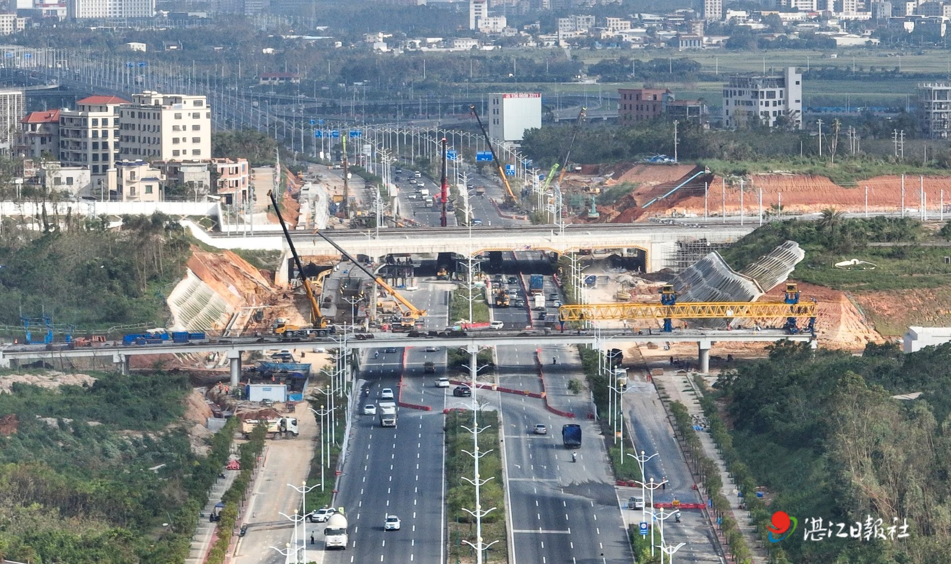 10月11日上午,湛江北站附近的湛江大道改扩建工程施工现场机器轰鸣,虽然刚经历了台风“麦德姆”的洗礼,但是现场依然是一片繁忙的景象。记者在现场看到,湛江北站南侧跨湛江大道桥梁的桥面铺设已接近尾声,北侧跨湛江大道桥梁的桥墩也已浇筑完毕。随着广湛高铁通车的日益临近,湛江北站周边相关配套工程也铆足马力赶进度。