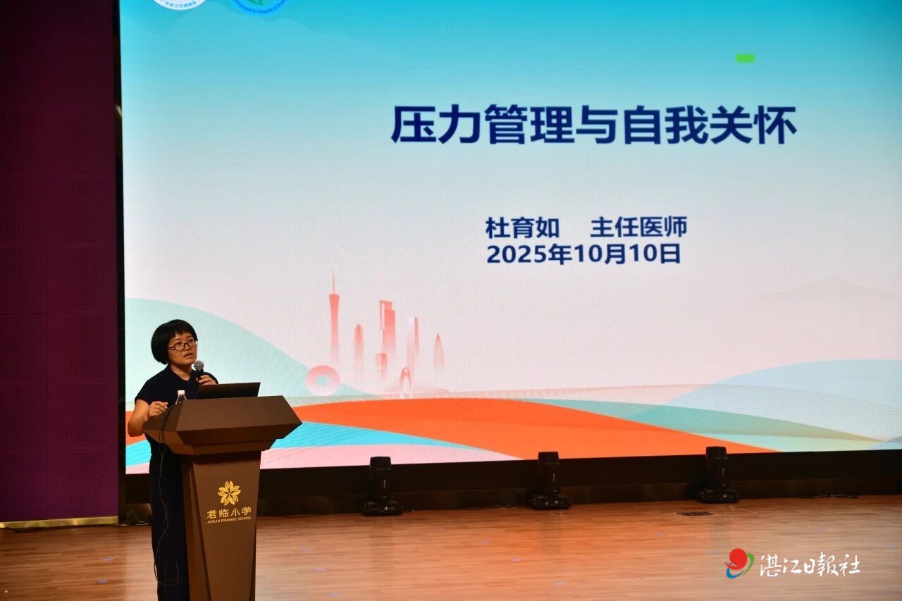 湛江市第三人民医院主任医师杜育如为君临小学的教职工们带来了题为《压力管理与自我关怀》的专题讲座,结合教师职业特点,深入浅出地分析了压力来源及其对身心健康的潜在影响,并分享了科学实用的压力管理策略与自我关怀技巧。讲座内容翔实,互动积极,获得了在场教师的一致好评。