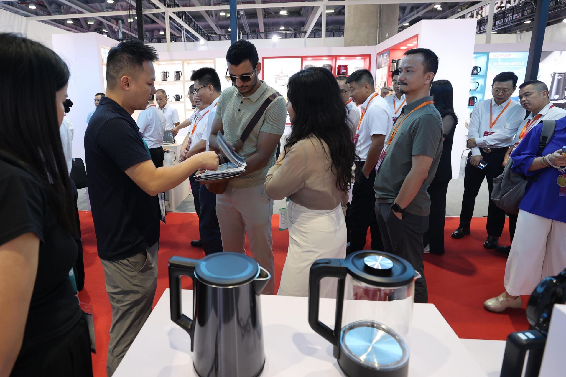 在展会现场,车载热水壶、家用制冰机、9L多用锅等产品密集亮相。参展商看得目不暇接,纷纷表示“实在记不过来这么多亮点参数”。来自哈萨克斯坦、俄罗斯、乌拉圭等国的客商,凭敏锐商机洞察力穿梭各家电展位,细致考察产品、洽谈合作,寻觅合作伙伴。