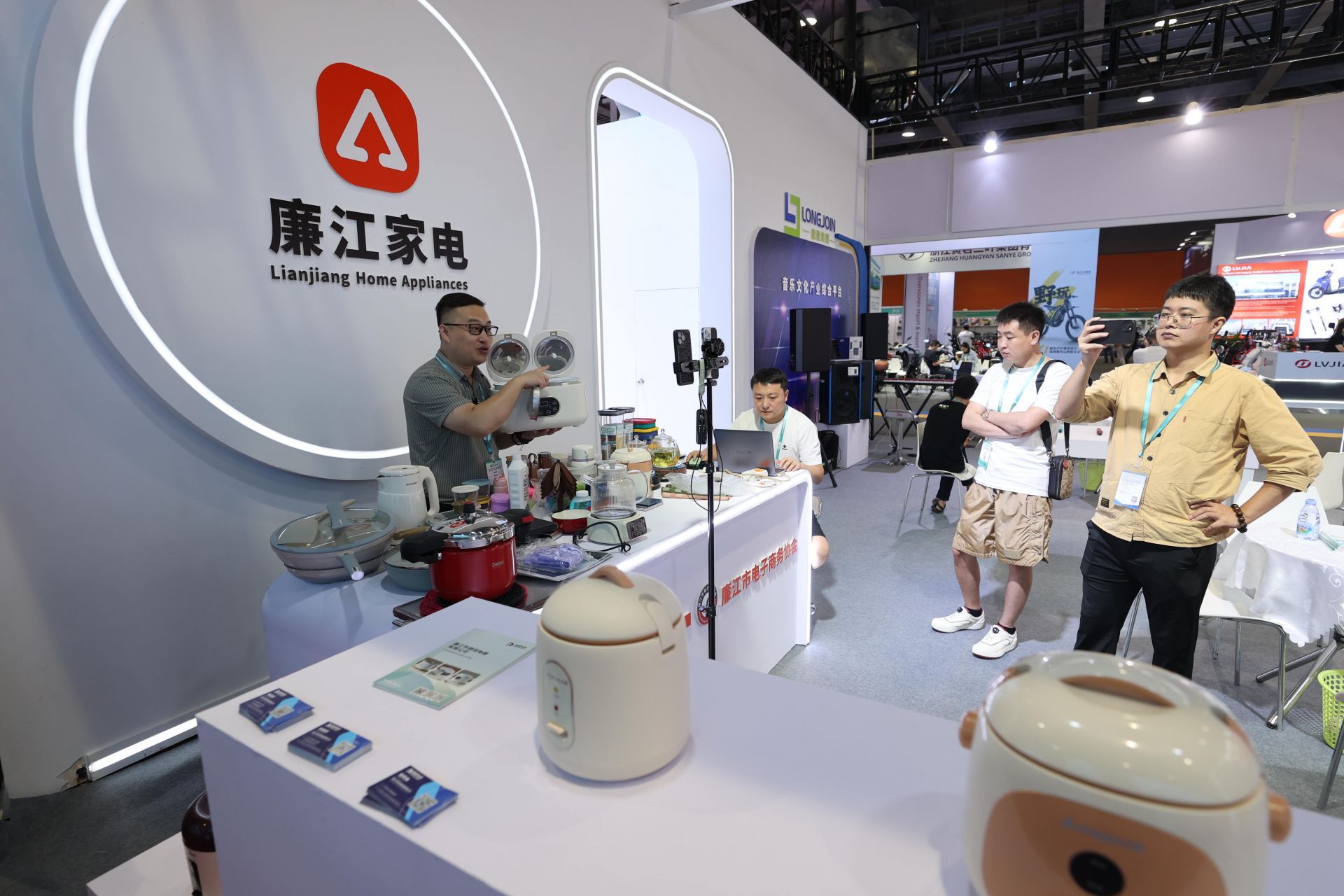 15日,在2025廉江家电秋季(广州)博览会上,有厂家进行直播带货。