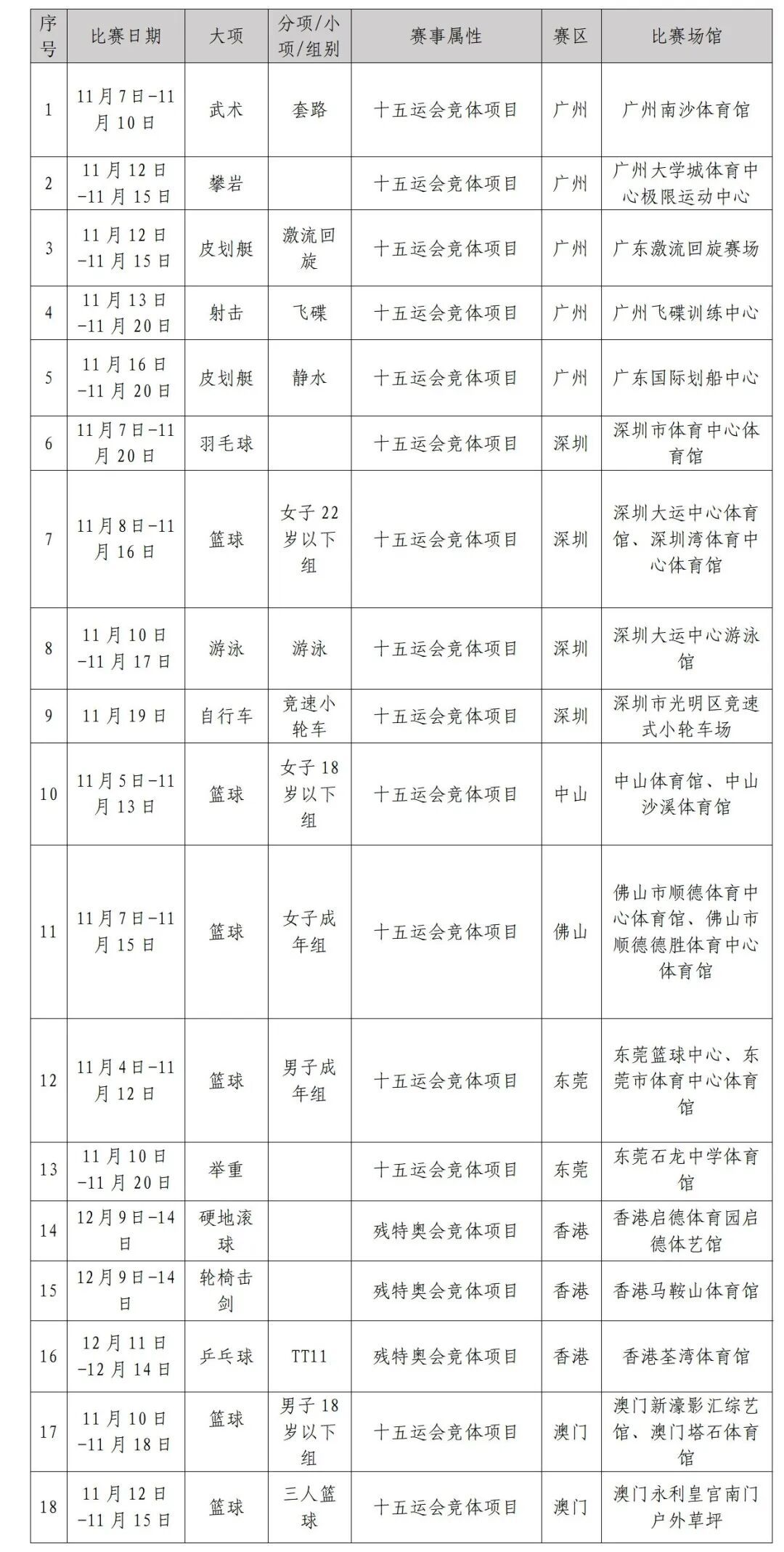包括广东赛区13个项目,分别是:十五运会羽毛球、篮球(男子成年组、女子成年组、女子22岁以下组、女子18岁以下组)、武术(套路)、游泳、举重、自行车(竞速小轮车)、皮划艇(静水、激流回旋)、攀岩和射击(飞碟)项目,分布在广州、深圳、中山、佛山和东莞5个城市。