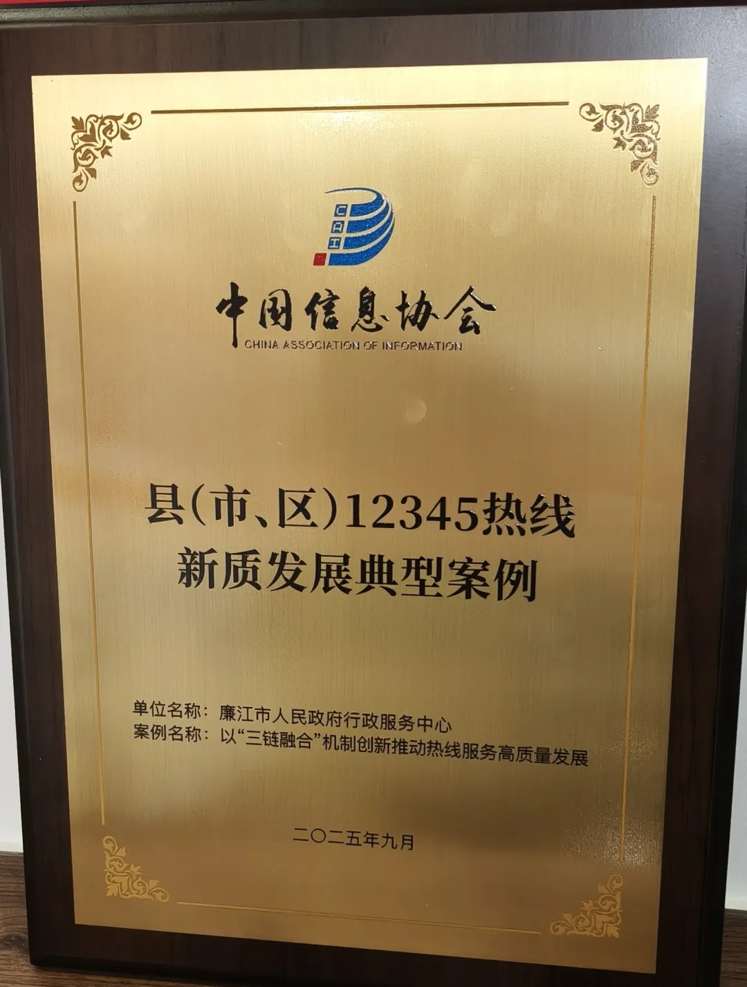 近日,2025县(市、区)12345热线发展大会发布了《县(市、区)12345热线新质发展典型案例集(2025)》。其中,廉江市12345政务服务便民热线凭借自主创新的“三链融合”机制,获评“2025县(市、区)12345热线新质发展典型案例”。