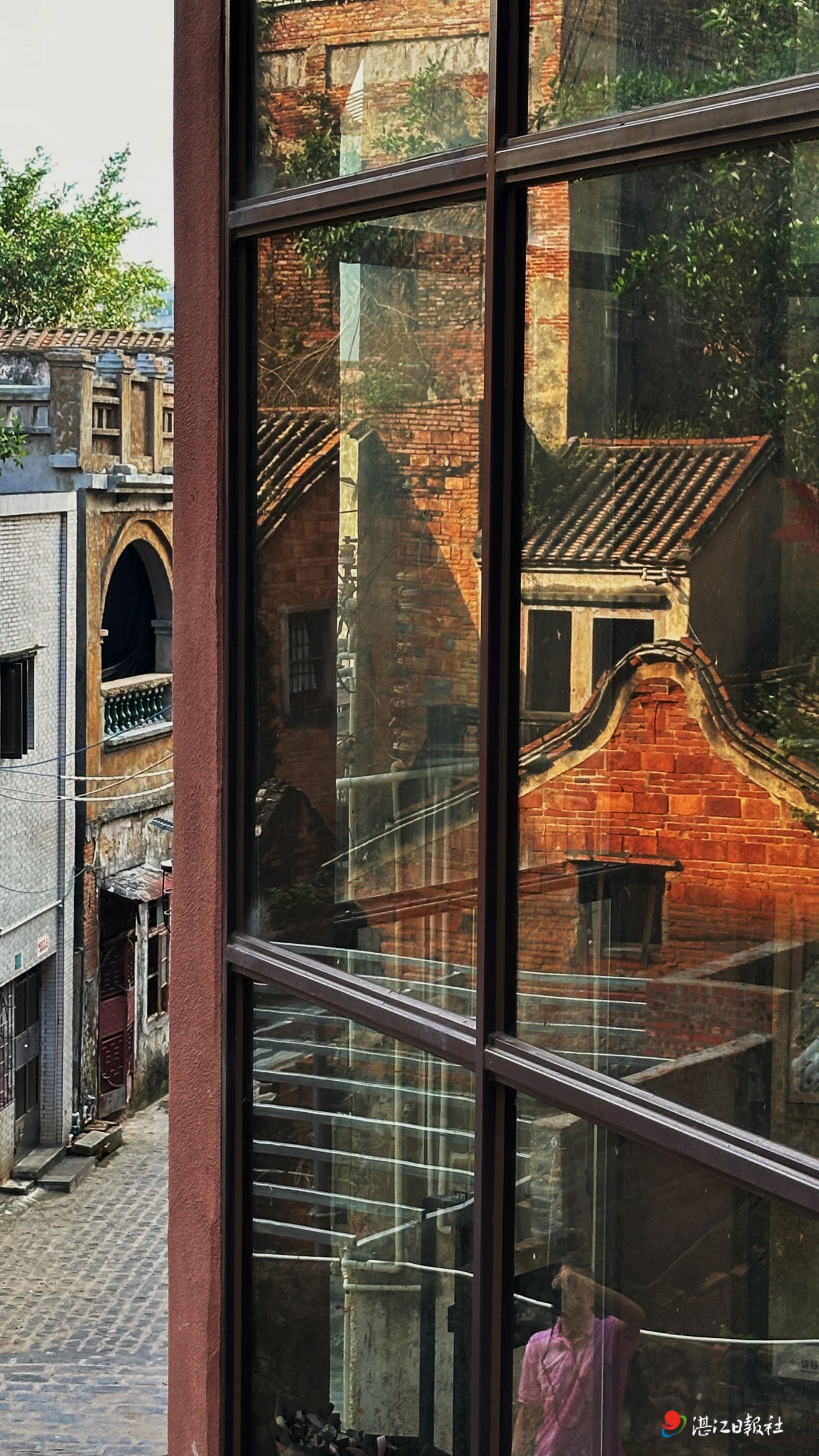 10月16日清晨,金色的晨光洒落在赤坎老街的青砖灰瓦间。古渡口七号码头旁,在暖阳映照下,老屋舍悄然“复刻”于一栋现代建筑的玻璃幕墙上。一位手持相机、寻觅光影的影友置身其中。传统与现代在晨曦中交相辉映,于倒影与实景的叠合中,焕发出别样的魅力。