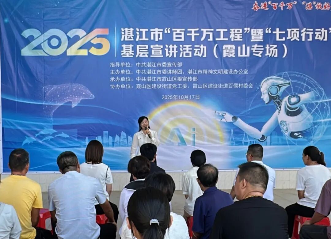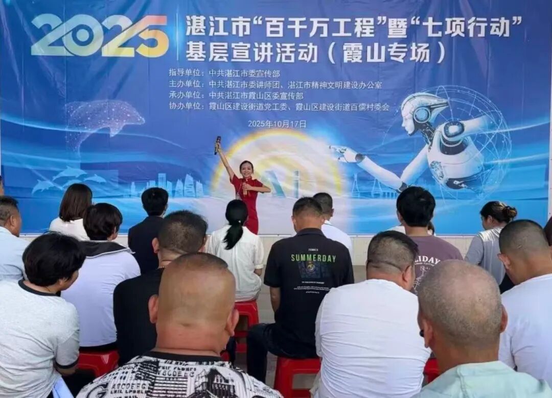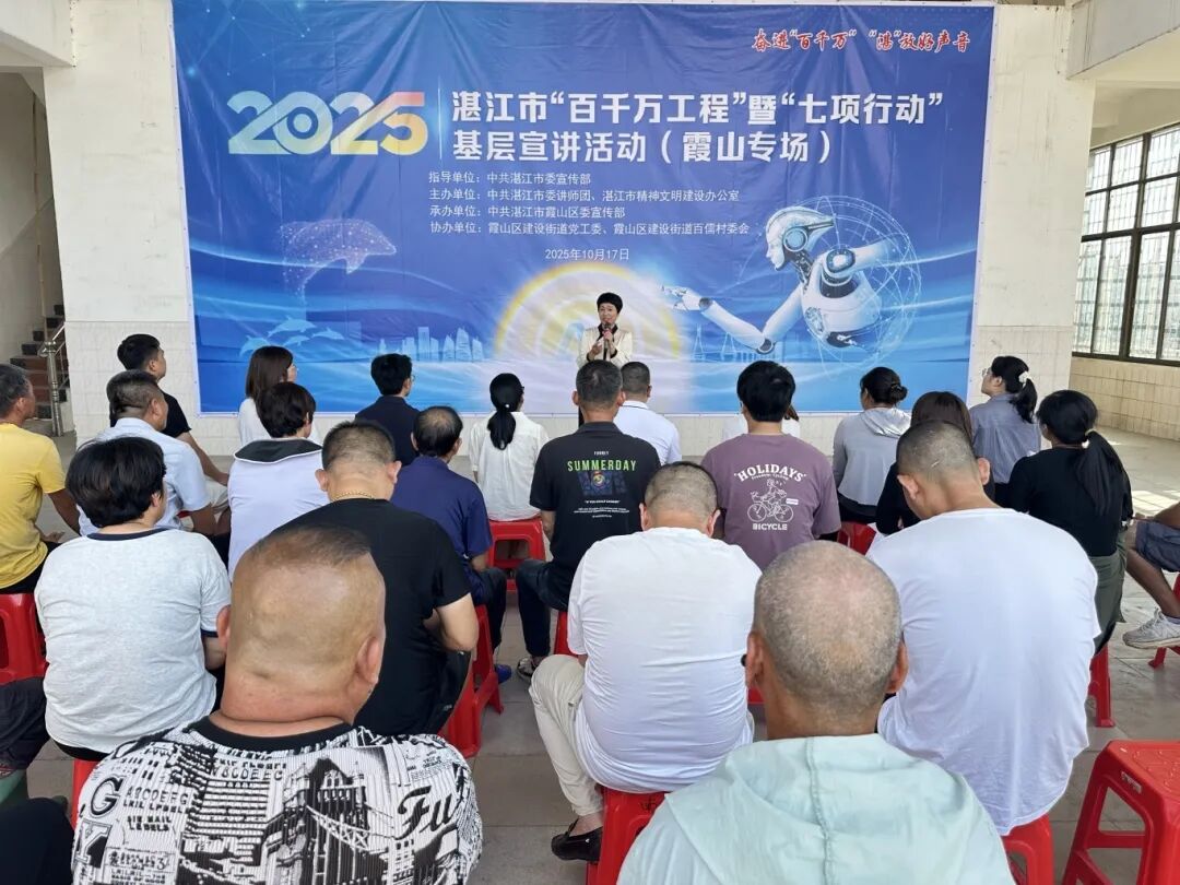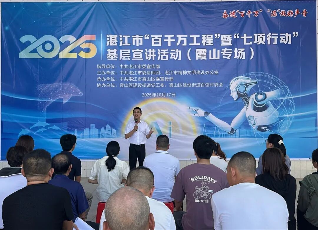10月17日,2025年湛江市“百千万工程”暨“七项行动”基层宣讲活动分别在霞山区建设街道百儒村新时代文明实践站、麻章区麻章镇笃豪村新时代文明实践站同步举办。活动由湛江市委宣传部指导,市委讲师团、市文明办主办,两场活动共吸引近100名镇(村)党员干部及群众参与,进一步让党的创新政策理论“沉”下去、“活”起来。
