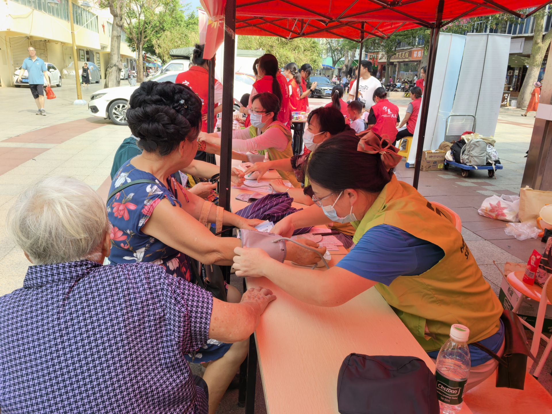 在霞山区步行街,现场气氛热烈。主办方精心设置了多个功能区,吸引了大量市民驻足参与。在“宁养咨询”点前,专业的宁养院医护人员耐心地为市民测量血压、血糖,并详细解答关于宁养服务对象、申请流程等问题。