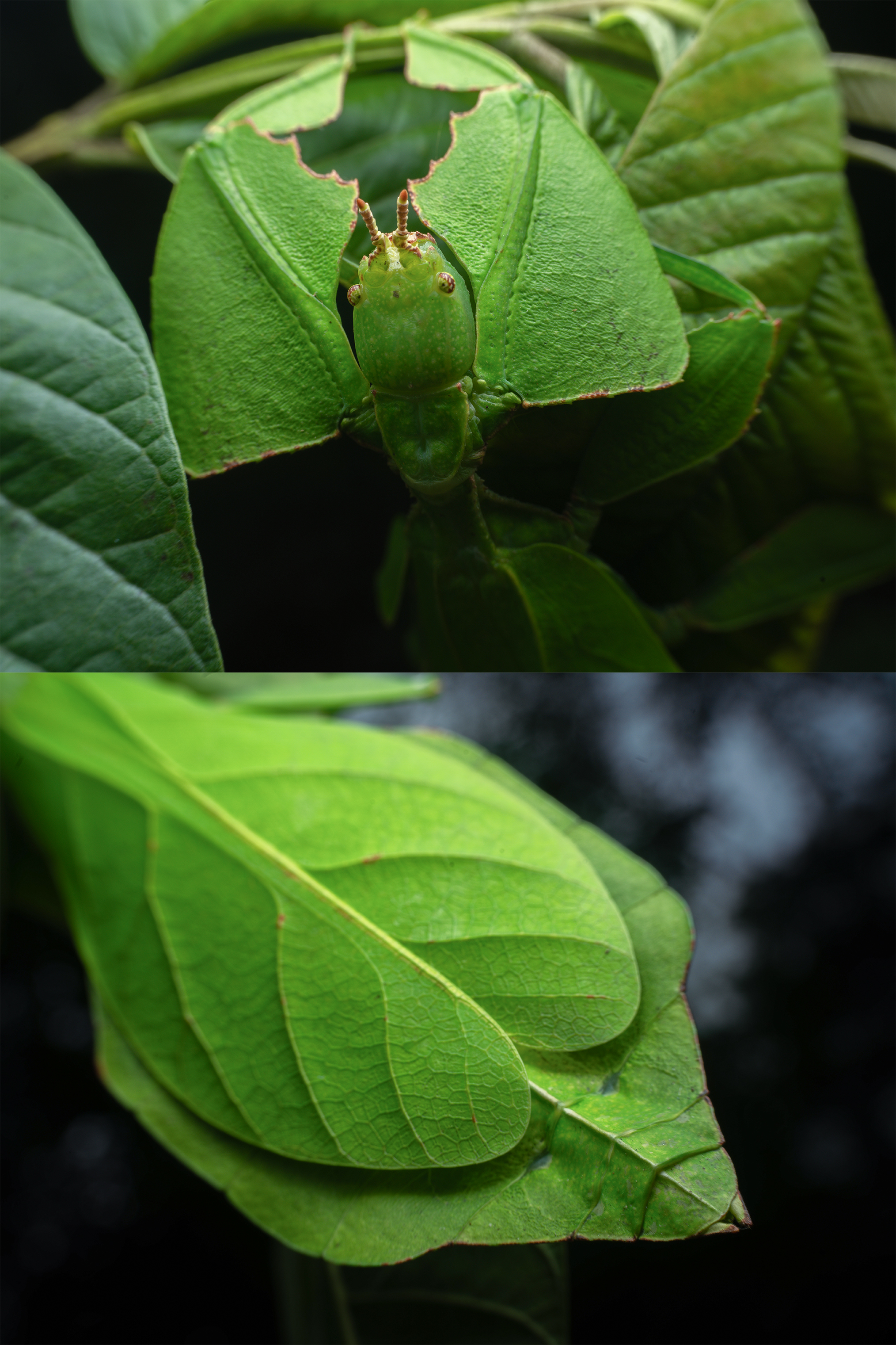 据调查团队介绍,这只滇叶䗛栖息于一株越南山香圆植物上,从个体形态可明确判断为成体雌性。当地群众表示,此前曾偶然见过这类 “叶子虫”,但其外形与树叶高度相似,不仔细观察很难分辨。专家进一步解读,滇叶䗛的拟态能力堪称昆虫界的 “伪装大师”:头部与常见叶䗛形态相近,而胸部、腹部的形态与纹路完全模拟树叶特征——前肢不仅演化成叶片形状,边缘还拟态出自然界中树叶腐蚀的色彩;背部鞘翅宛如一片完整的嫩叶,与植物叶片重合时,肉眼几乎无法识别。更令人称奇的是,它还能通过调整身体颜色深度实现精准隐藏,背部呈嫩绿色、腹部为暗绿色,完美融入周边生态环境,有效规避天敌威胁。