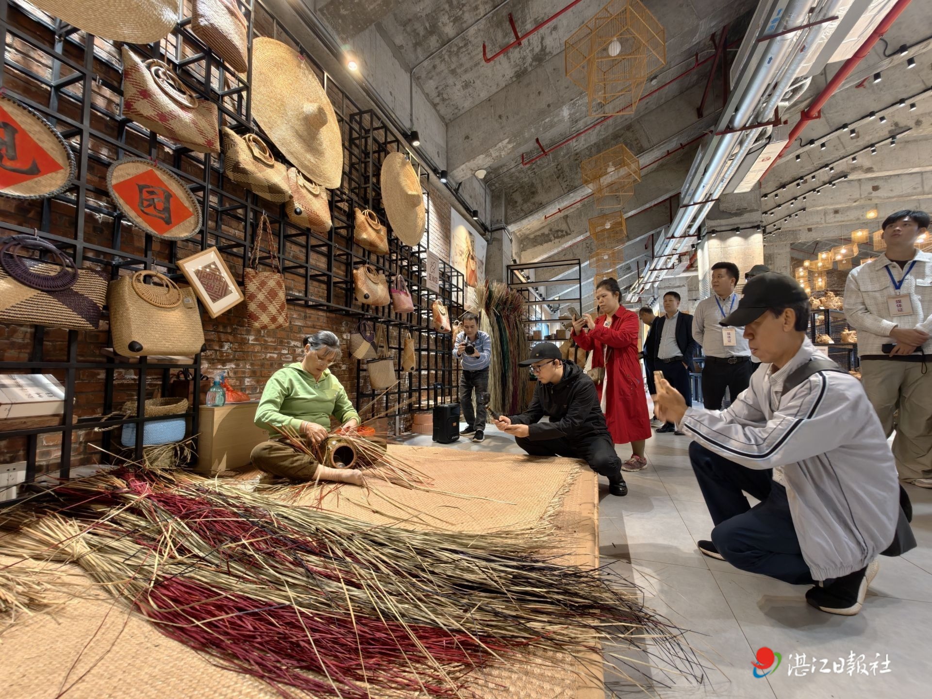 悬挂的竹编器物、造型各异的根雕、威风凛凛的醒狮道具……走进足荣村手作博物馆,浓郁的雷州文化气息扑面而来。在互动区,一位编织匠人正盘腿坐在铺着草席的工作台上,灵巧地将蒲草经纬交错,身旁散落的彩色蒲草与成品包包形成鲜明对比。据工作人员介绍,这类蒲草包需经选草、编织、定型等多道工序,熟练匠人也要数天才能完成。而在另一侧的文创展区,蒲草编织与现代设计碰撞出别样火花:蒲草编的灯饰、帽子、艺术摆件,将传统工艺注入时尚基因,助力乡村手作“破圈”出彩。
