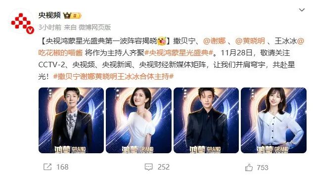 10月26日上午9时,央视频微博发布消息:撒贝宁、 谢娜、黄晓明、王冰冰将作为主持人齐聚央视鸿蒙星光盛典。11月28日,敬请关注CCTV-2、央视频、央视新闻、央视财经新媒体矩阵,让我们并肩穹宇,共赴星光!