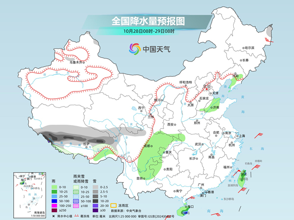 明天,西藏中南部、青海南部、川西高原北部等地部分地区有小到中雪或雨夹雪,其中,西藏中部等地部分地区有大到暴雪,局地大暴雪。辽东半岛、西藏东南部、黄淮东部、西南地区东部、海南岛、台湾岛等地部分地区有小到中雨,其中,海南岛东南部、台湾岛东部等地部分地区有大雨,局地暴雨。