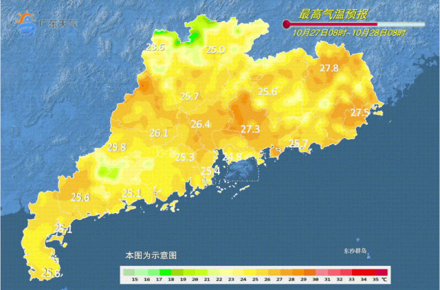 27-28日,南部沿海市县多云间阴天,局部有零星小雨,其余市县多云间晴天。最低气温:粤北市县16~18℃,南部沿海市县21~23℃,其余市县18~20℃。