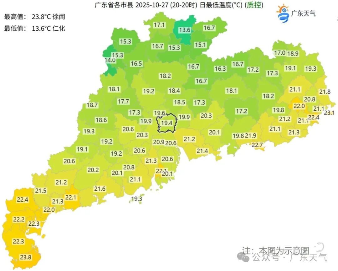 弱冷空气补充影响下,昨日广东清远北部和韶关北部市县最高气温较25日下降了1~3℃,其余大部市县最高温度则上升1~3℃;今晨(27日)大部市县最低气温较昨日下降了1~3℃,其中韶关仁化录得全省最低气温13.6℃。