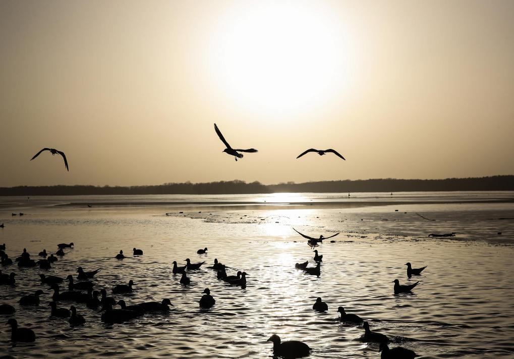 2021年2月25日,水鸟在德国首都柏林泰格尔湖面上游弋和飞翔。新华社记者单宇琦摄