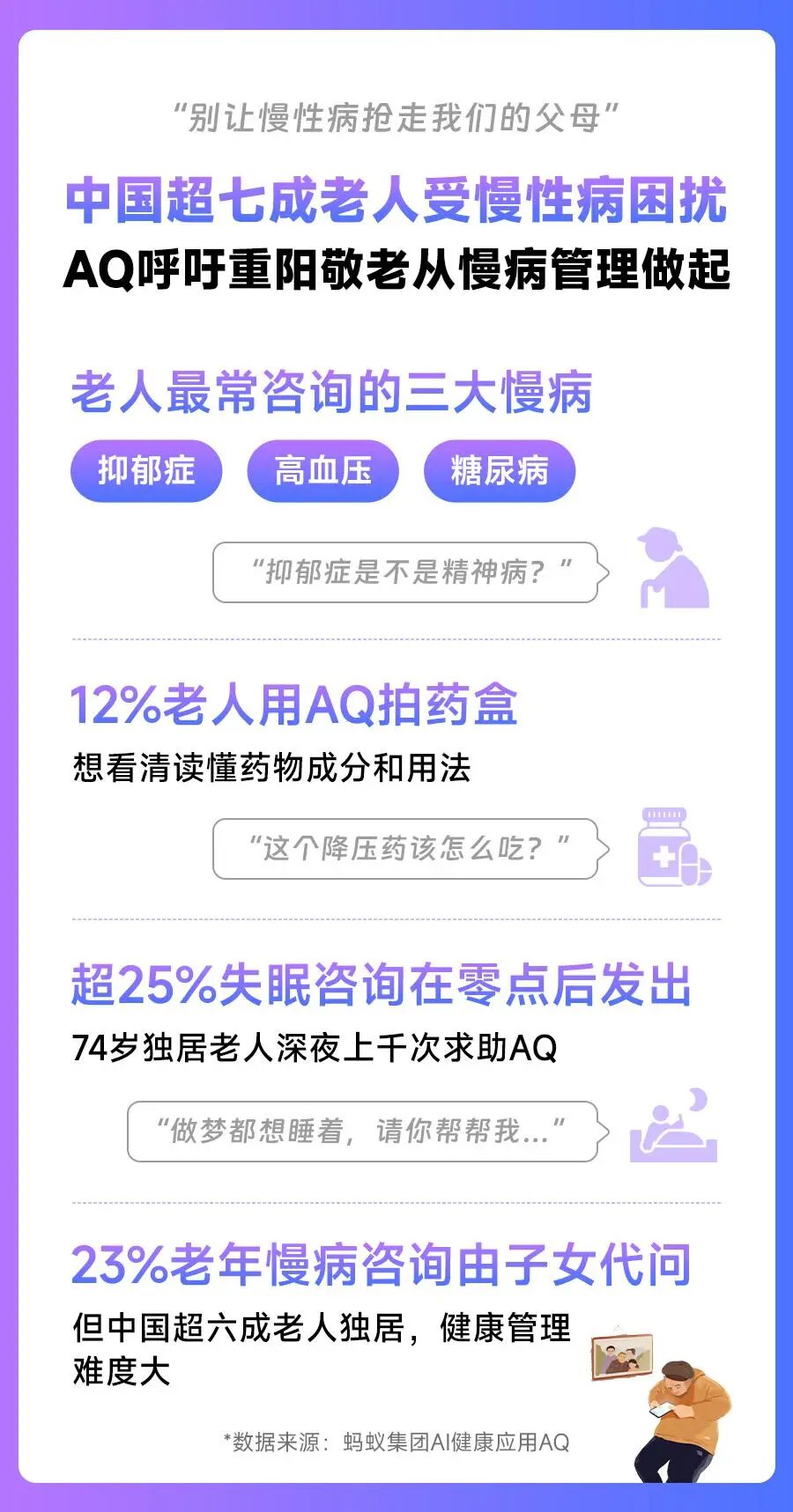 10月27日,蚂蚁集团AI健康应用AQ发起重阳节倡议《别让慢性病抢走我们的父母》,呼吁全社会将敬老爱老延伸至老年慢病管理这一健康问题,并推出AI拍血压血糖、家人健康风险预警、慢病用药定时提醒等5项产品新功能,帮助子女将说不出口的担心,变成真切的关心。
