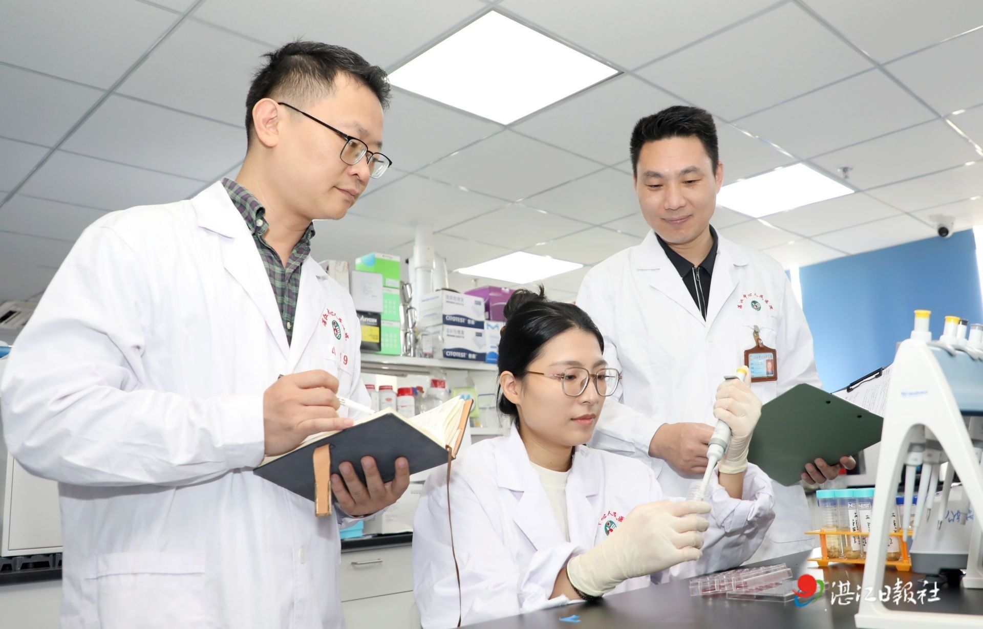 湛江中心人民医院中医药防治传染病重点研究室的刘衍志博士(左)与中医科汪东涛博士(右)与研究生共同讨论分子生物学实验结果。 林颖 摄