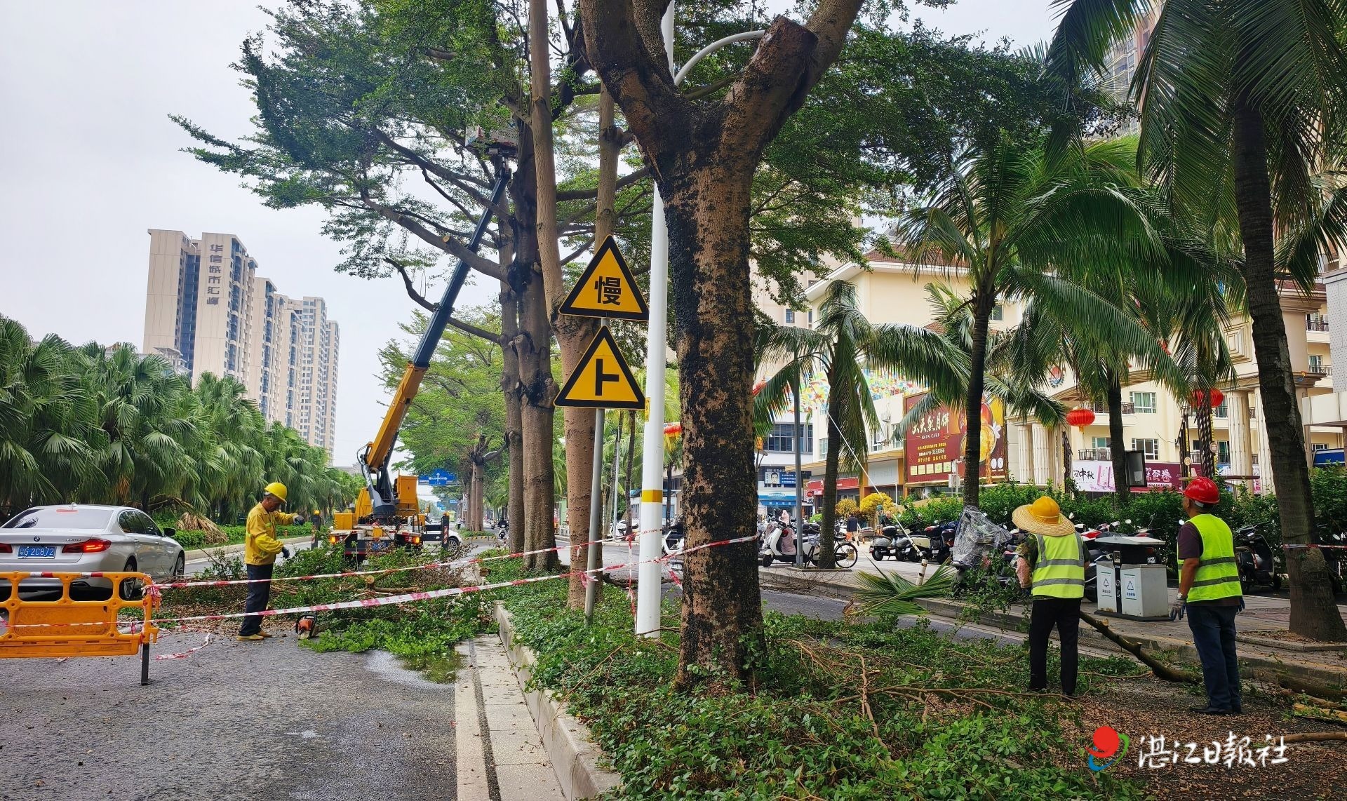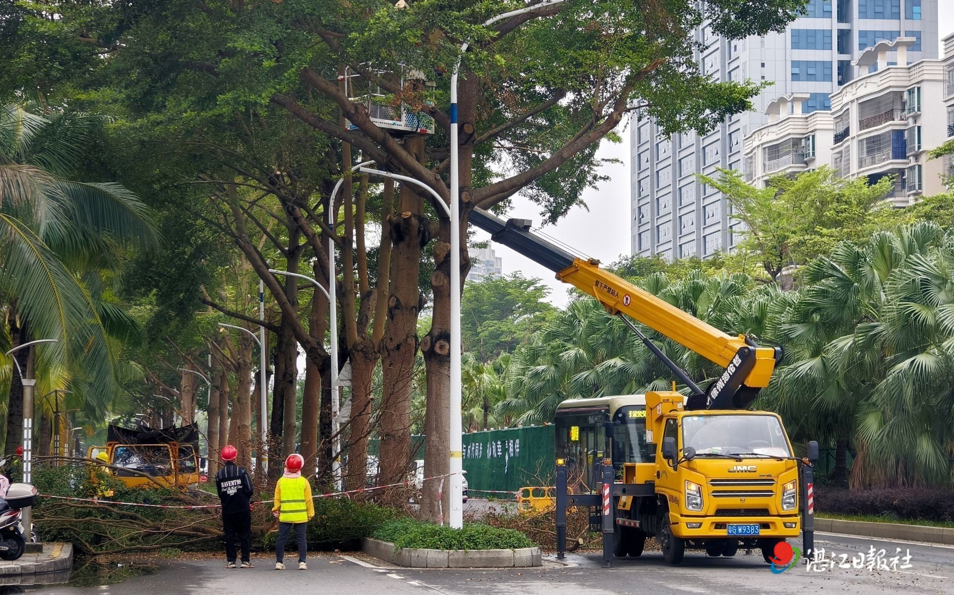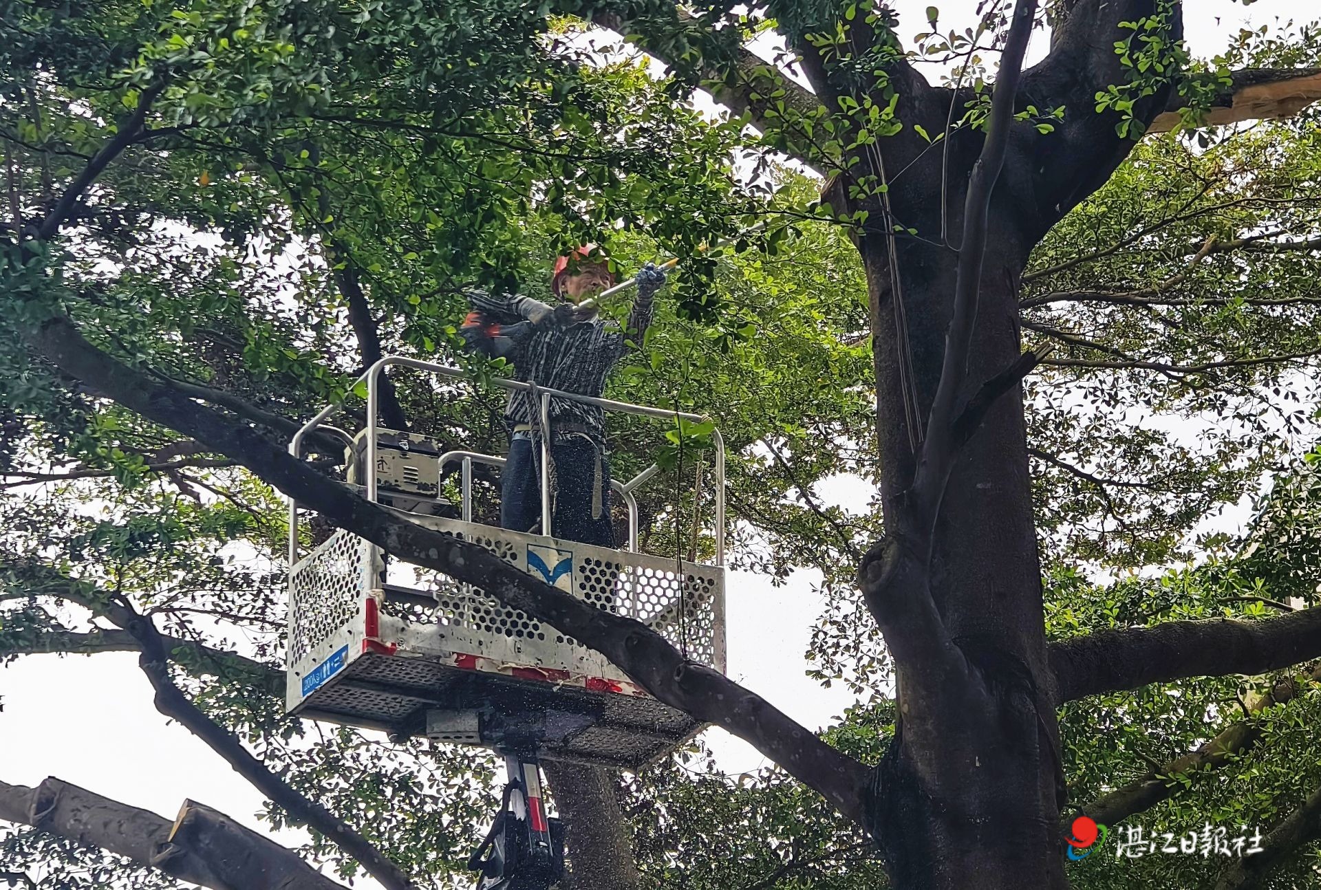 10月28日,湛江赤坎区军民路沿线一派忙碌景象——园林及市政工作人员正借助高空作业车,对道路两侧的路树开展修剪、残枝清理作业,全力保障道路通行安全与秩序。