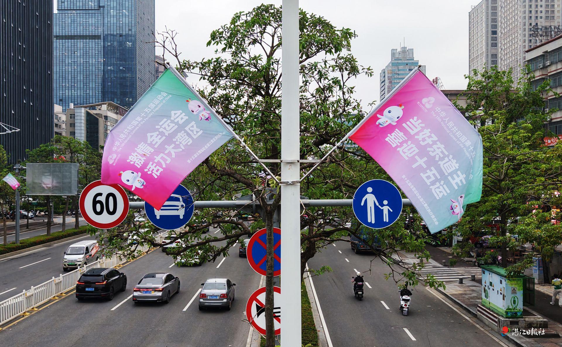 一面面印有“激情全运会 活力大湾区”和“当好东道主 喜迎十五运”标语的彩旗,在绿树成荫的道路两旁整齐悬挂,显得格外醒目。十五运部分赛事将在湛江举办,彩旗的上街,点燃了港城人民的期盼与热情。