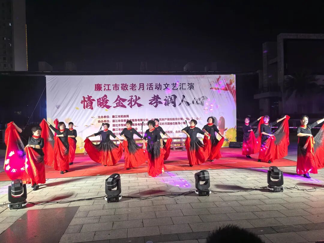 27日晚,由廉江市民政局主办的“情暖金秋,孝润人心”敬老月文艺汇演在文化广场举行。廉江市民政局党组书记、局长潘自力,中国人民财产保险股份有限公司廉江支公司经理林东等领导与社区60岁以上老年人、老年文艺团体、志愿者、爱心企业代表一起观看演出。