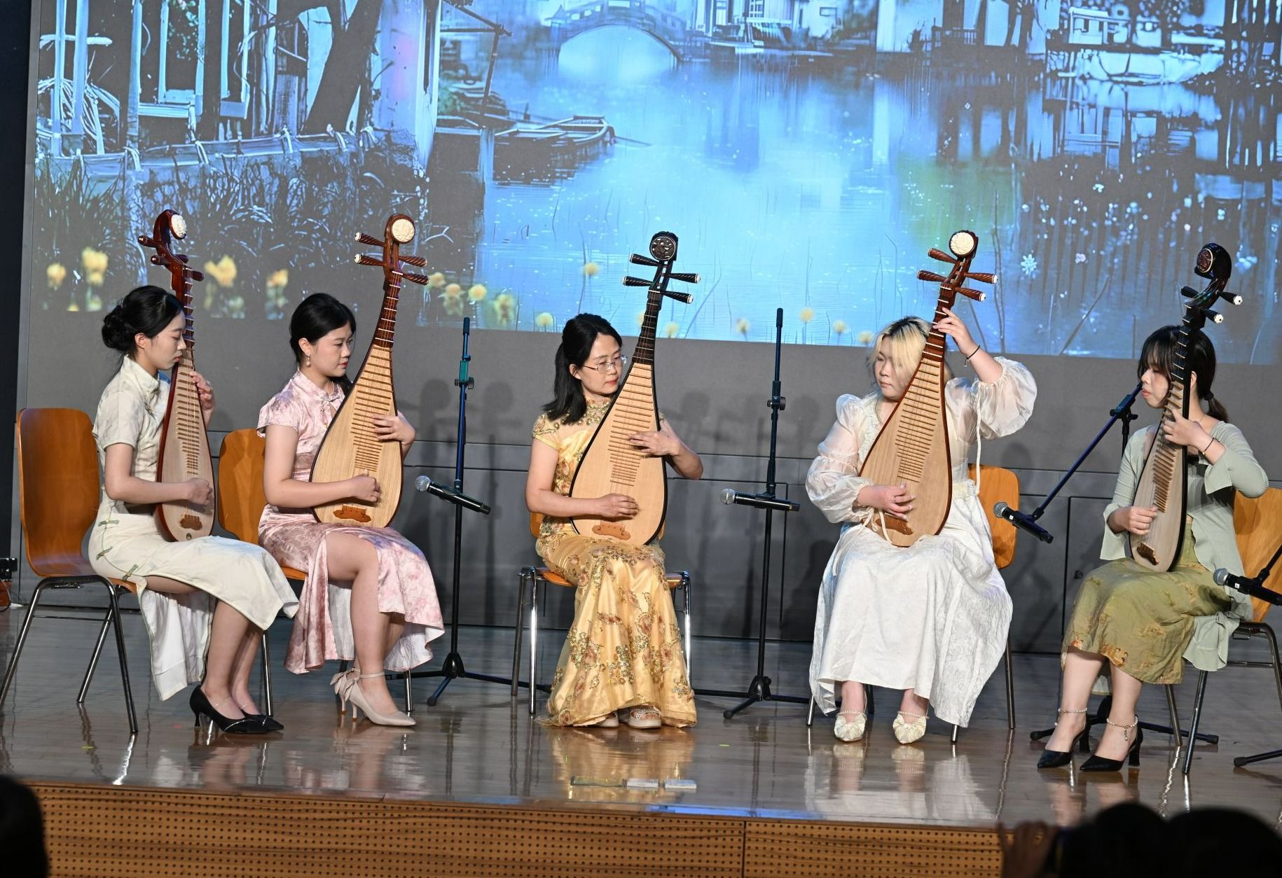 据悉,本次音乐夜活动以“促交流、助湾区”为核心主题,吸引了粤港澳三地多所高校共同参与,包括香港大学、澳门大学、澳门科技大学、华南理工大学、岭南师范学院、广州大学、佛山大学、汕头大学、华南农业大学、广州中医药大学等,形成跨地域、多院校的文化交流矩阵。 活动现场灯火璀璨,岭师参演学子带来了精心编排的琵琶重奏《梦入江南》,在悠扬旋律中彰显传统文化底蕴。其细腻的情感传递与默契的舞台配合,扎实的专业功底与灵动的艺术表达,赢得现场观众阵阵掌声。表演结束后,岭师参演师生一行与其他高校代表围绕“艺术创作与文化传承”“湾区青年责任”等话题深入交流,分享岭师音舞学院挖掘地方音乐文化,融入实践教学的育人成果。