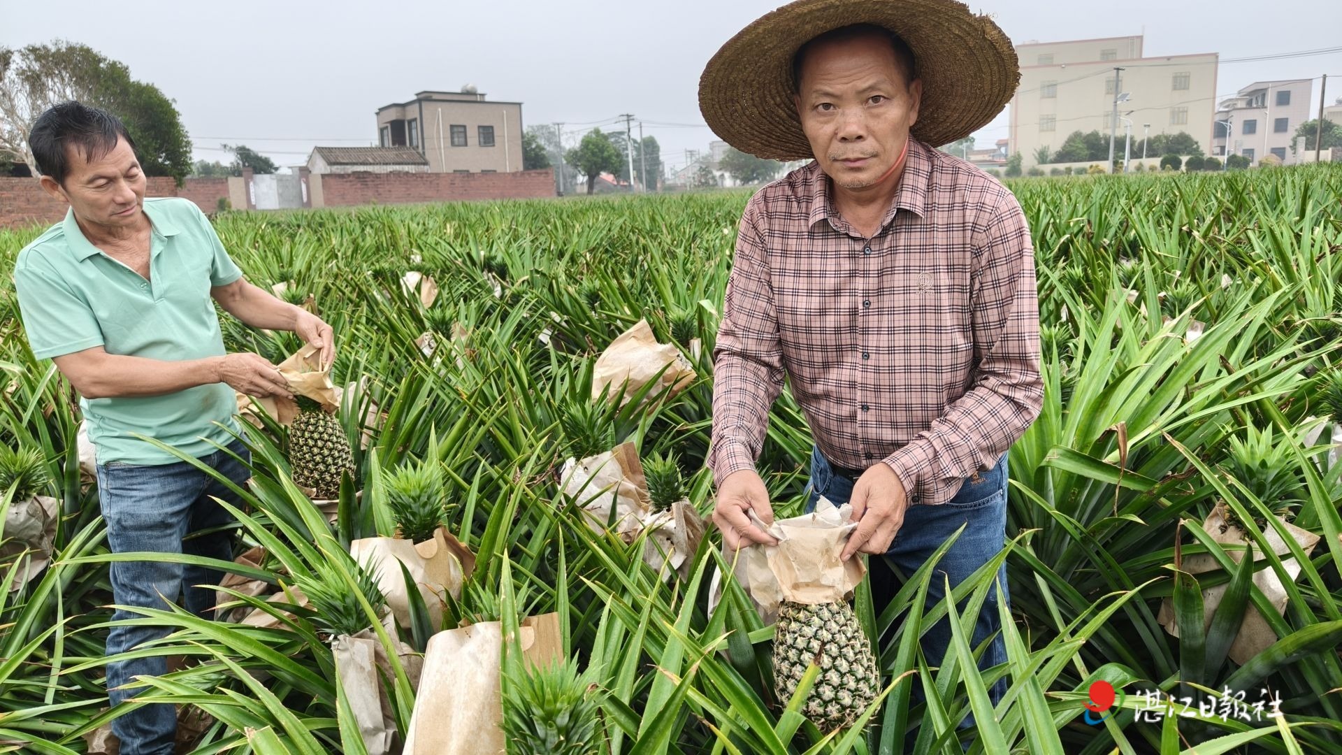 曲界镇农民在“菠萝公社”高校技术人员的指导下采用套袋技术提高菠萝品质。