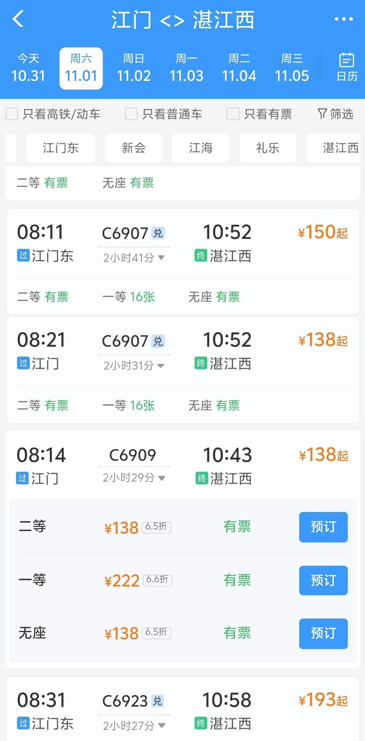 记者在铁路12306手机客户端查询发现,江门到湛江西站多趟列车票价实行低至6.5折优惠。以C6909次列车为例,一等座票价实行6.6折后为222元;二等座票价实行6.5折后为138元。此番优惠将进一步降低粤港澳大湾区同粤西的出行成本,为沿线探亲访友、商务通勤提供高性价比选择。