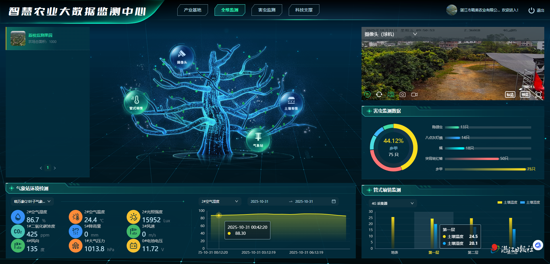 值得一提的是,示范园深度融合物联网、大数据与人工智能技术,打造了覆盖荔枝全生长周期的精准监测与智能管理平台。该系统不仅可实现灾害预警与防控,还支持土壤状态管理、果树生长跟踪、绿色种植管控与风险预判,全面提升果园管理效率。