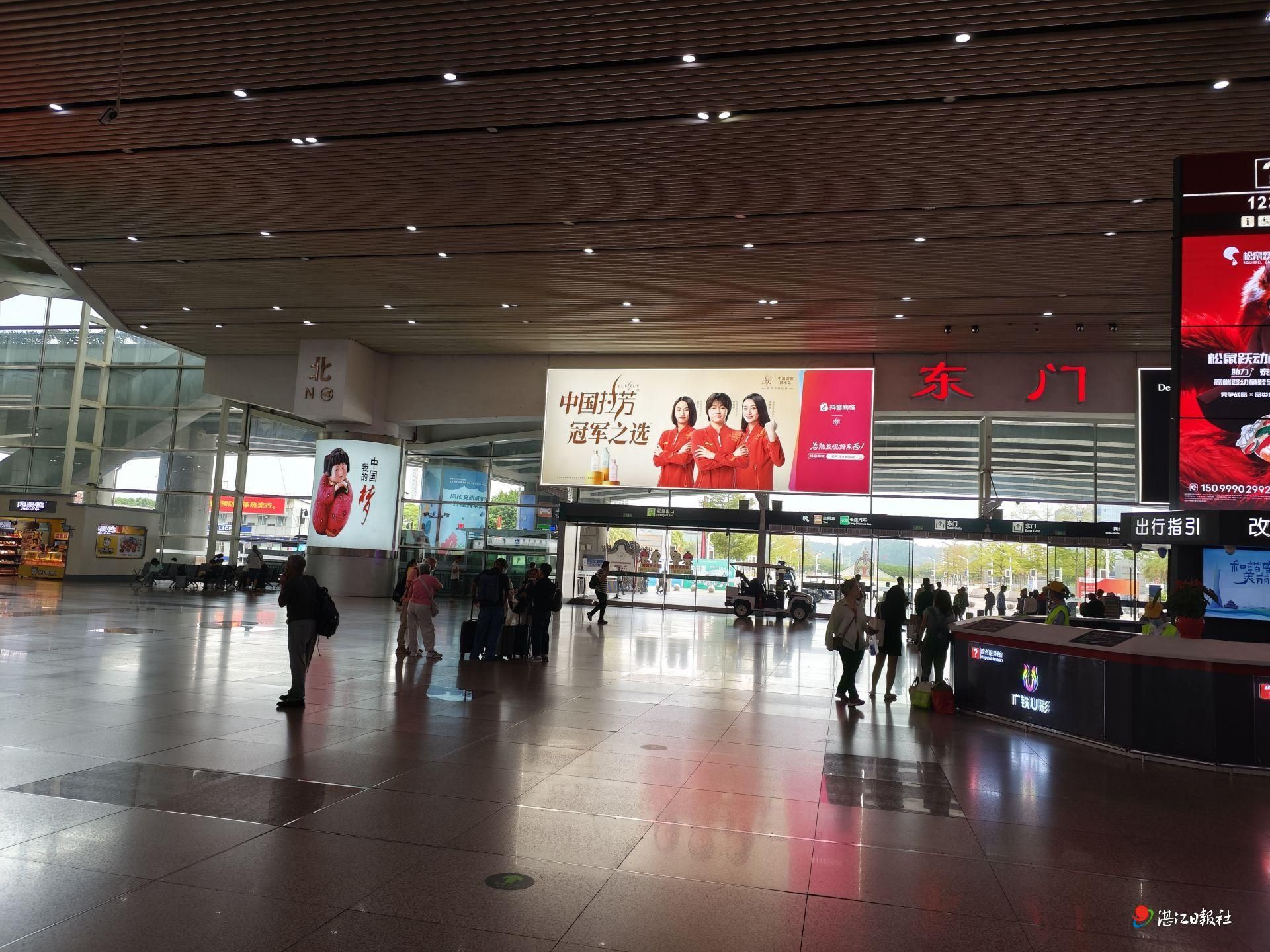 11月2日,记者从湛江抵达广州的第一站——广州南站,刚下动车就看到了全红婵(海报正中)和国家队队友陈芋汐(左)、昌雅妮(右)合拍的大型广告海报。