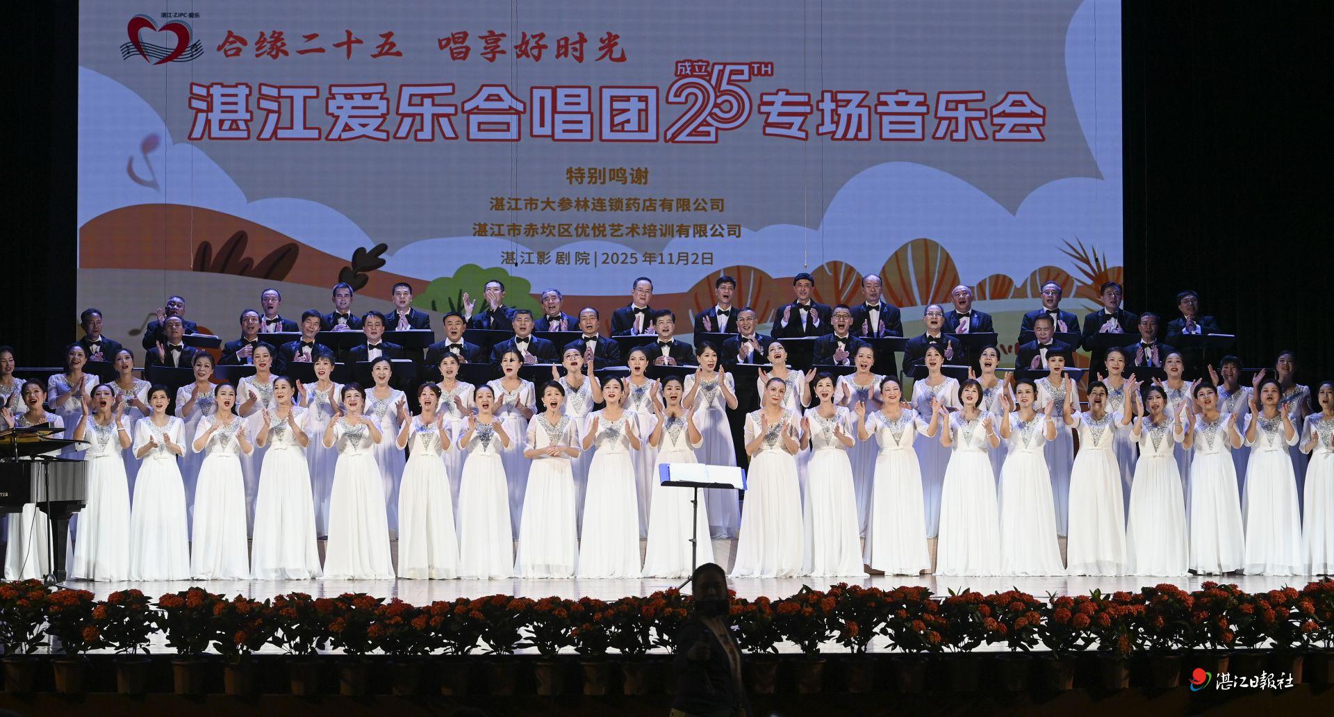 11月2日晚,湛江爱乐合唱团25周年专场音乐会在湛江影剧院开演。音乐会分“爱国爱家爱人生”和“唱他唱你唱自己”两个篇章进行,合唱团倾情演唱了《美丽的草原我的家》《年轻的朋友来相会》《军港之夜》等经典曲目,引起观众的共情与共鸣。