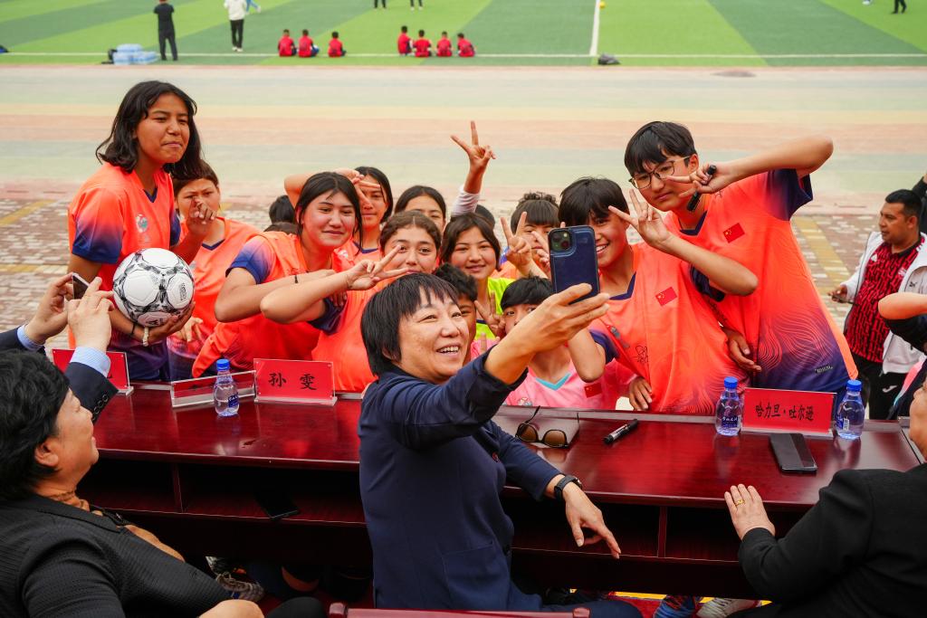 这是在2025新疆克孜勒苏柯尔克孜自治州足球联赛开幕式上,孙雯(前中)与阿图什市U13女子足球队合影(4月12日摄)。新华社记者 徐宏岩 摄