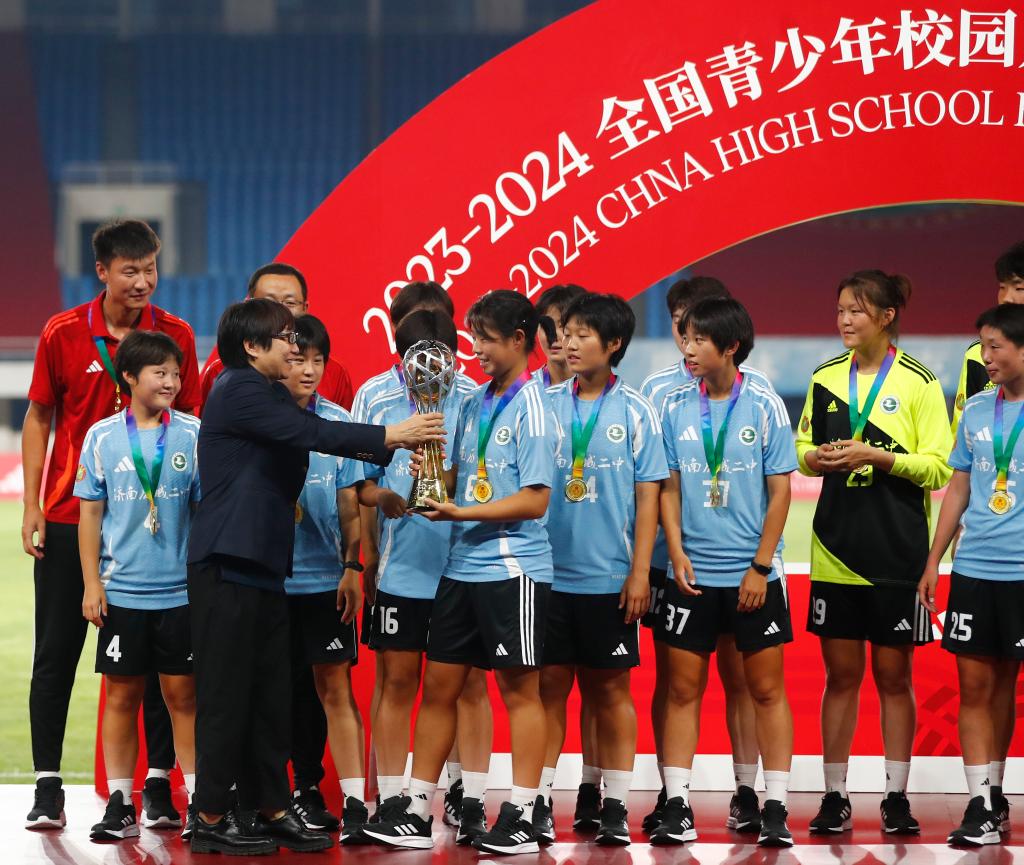 2024年8月30日,孙雯(左三)在颁奖仪式上为冠军济南市历城第二中学队颁发奖杯。当日,2023-2024全国青少年校园足球联赛高中女子组决赛在北京奥体中心体育场举行,济南市历城第二中学队2比0战胜保定市第一中学队,夺得冠军。新华社记者 胡星宇 摄