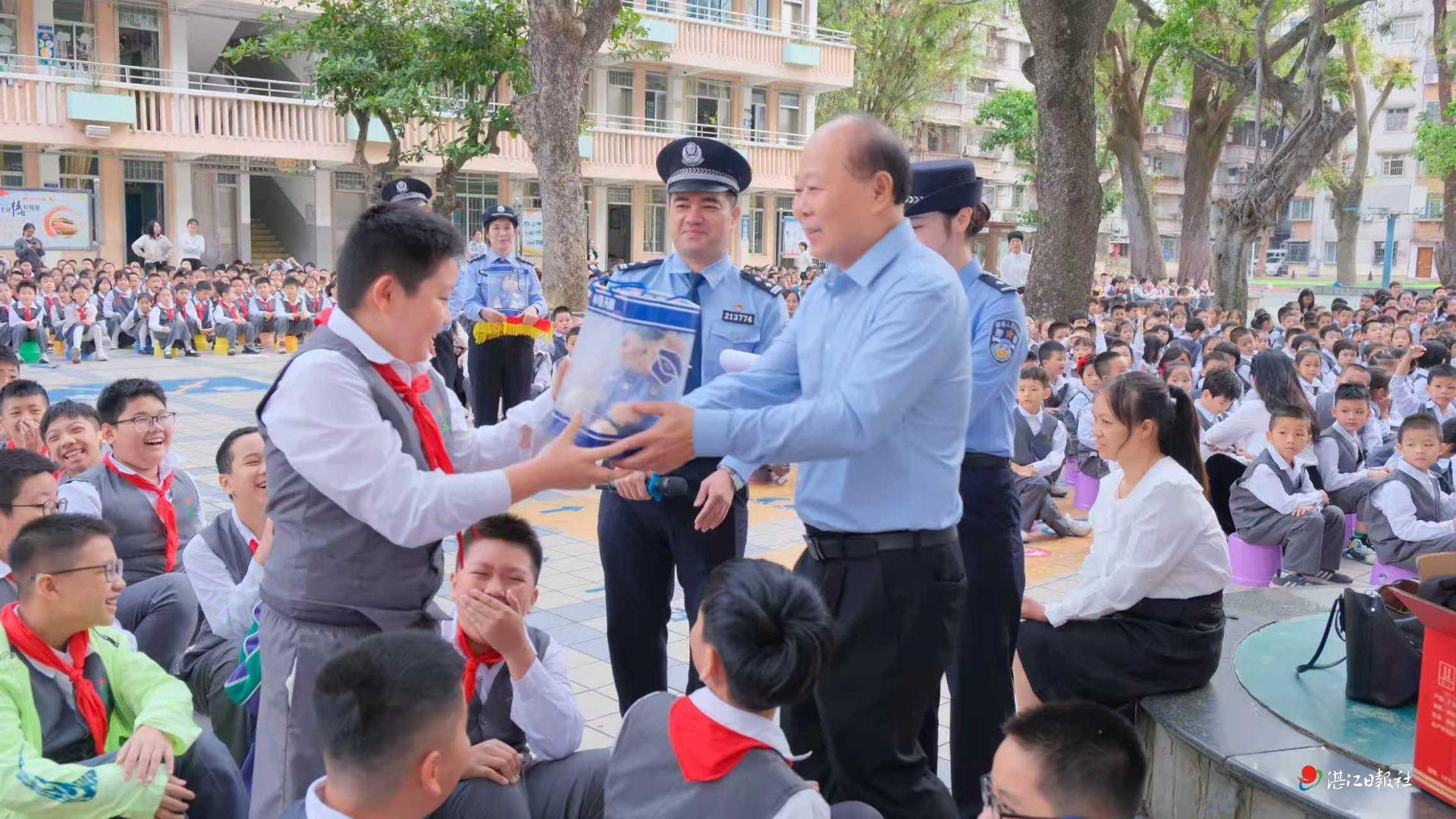 活动现场,曾海俊充分考虑青少年身心发展特点和校园安全实际需求,针对校园欺凌这一重点问题,采用“案例讲解+互动提问”的教学模式,用通俗易懂的语言、生动鲜活的案例,从多个与学生生活息息相关的维度展开讲解,引导学生树立正确的是非观,让法治知识真正入脑入心。同时,与师生们亲切互动,向全校师生介绍了湛江公安专属原创IP“警小豚”,并向教育局与校方赠送了“警小豚”文创纪念品,希望同学们在“警小豚”和湛江公安的陪伴和守护下,安全、健康、快乐地成长。