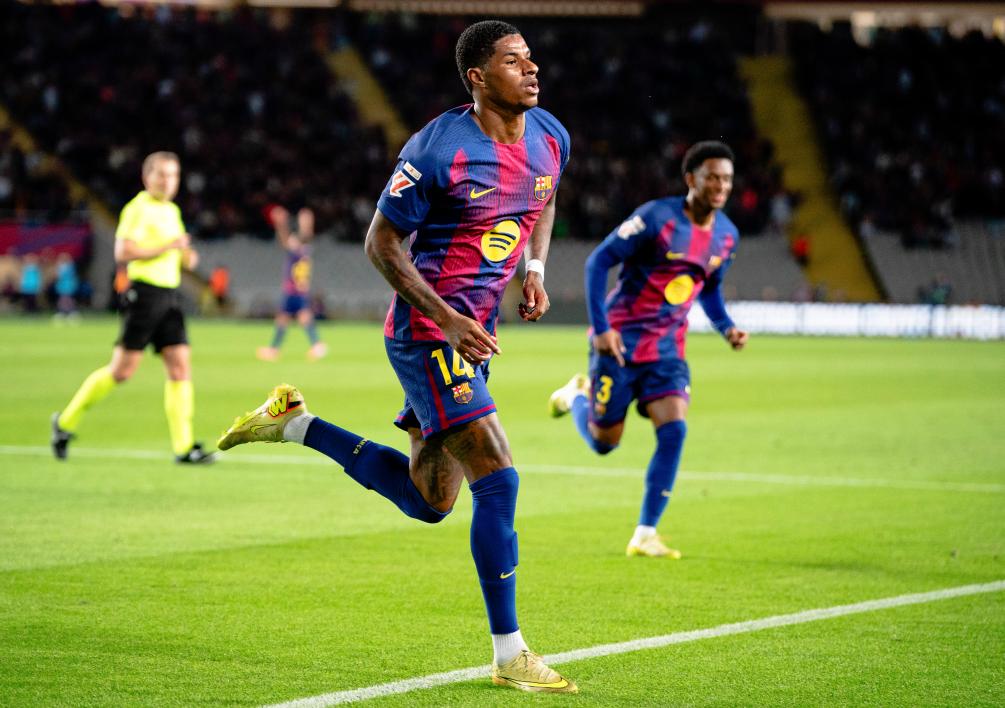 11月2日,巴塞罗那队球员拉什福德在比赛中庆祝进球。新华社发(胡安·戈萨 摄)