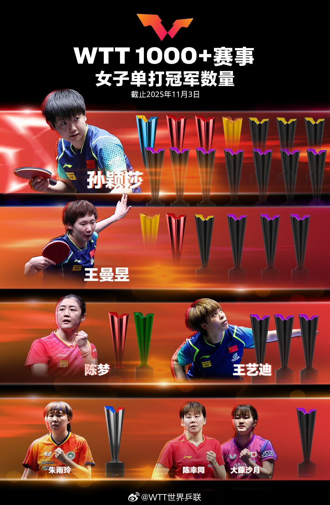 祝贺!WTT1000+冠军榜孙颖莎王楚钦继续领跑